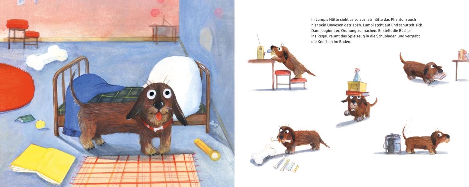 Lumpi räumt sein Körbchen auf und stellt sein Lieblingsbuch ins Regal. Darin geht es um einen Bösewicht, der wie ein Schatten durch die Gegend huscht und allen einen gehörigen Schrecken einjagt. Da entdeckt Lumpi plötzlich etwas hinter sich. Er dreht sich um, aber da ist niemand. Ein geheimnisvolles Phantom ist hinter ihm her, Lumpi ist sich ganz sicher. Eine wilde Verfolgungsjagd beginnt, aber das Phantom ist immer schneller als Lumpi. Als er seinen Verfolger endlich zu fassen bekommt, erlebt Lumpi eine große Überraschung.