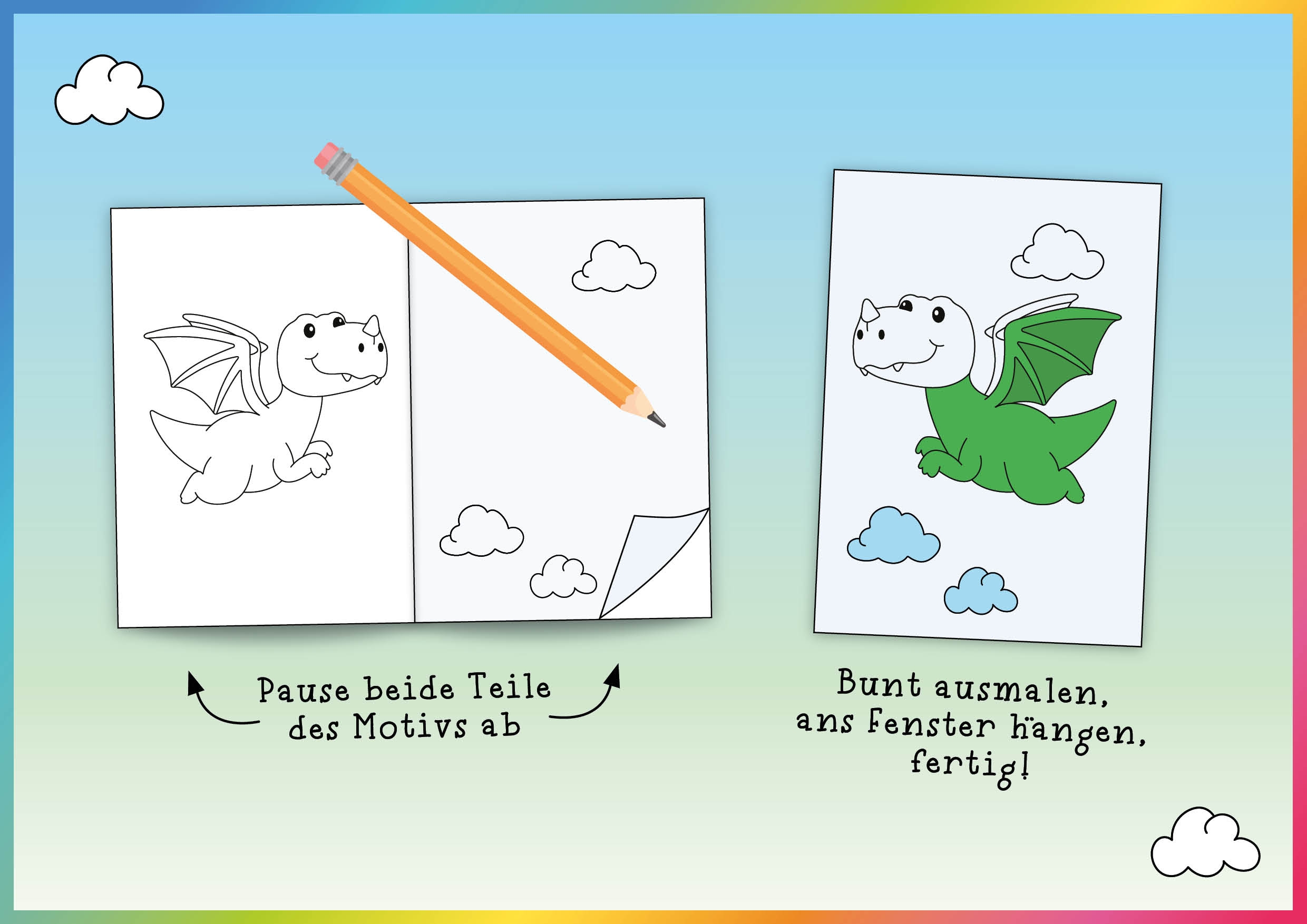 8 Spezialmotive auf Doppelseiten können auf extrastarkem Transparentpapier durchgepaust und ausgemalt werden. Einfach Umrisse abpausen, die Pauspapiermotive bunt ausmalen und als Fensterbild aufhängen. So leuchten deine heldenhaften Ritter noch mehr!