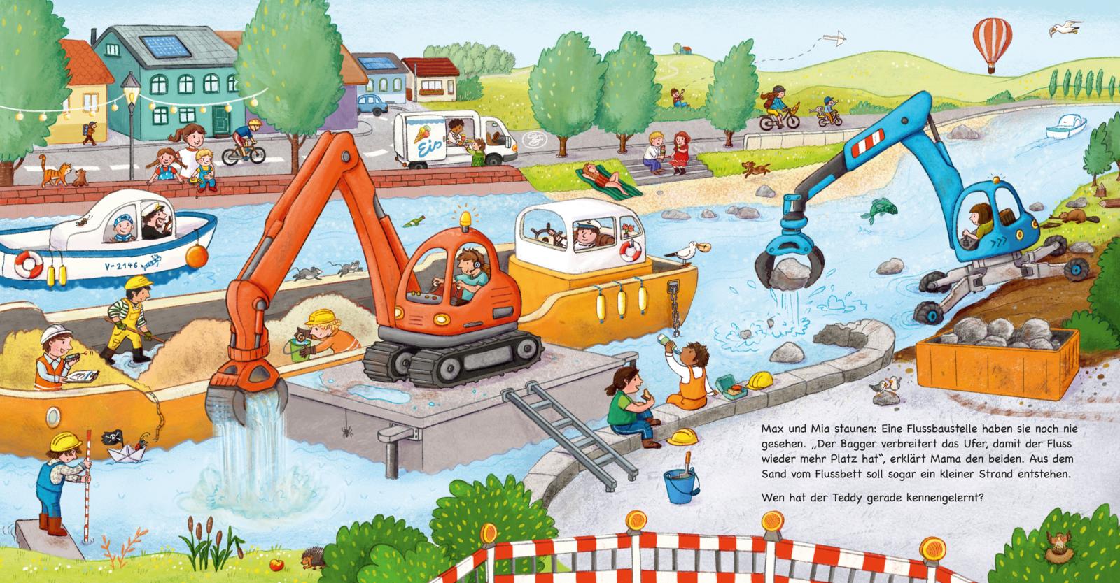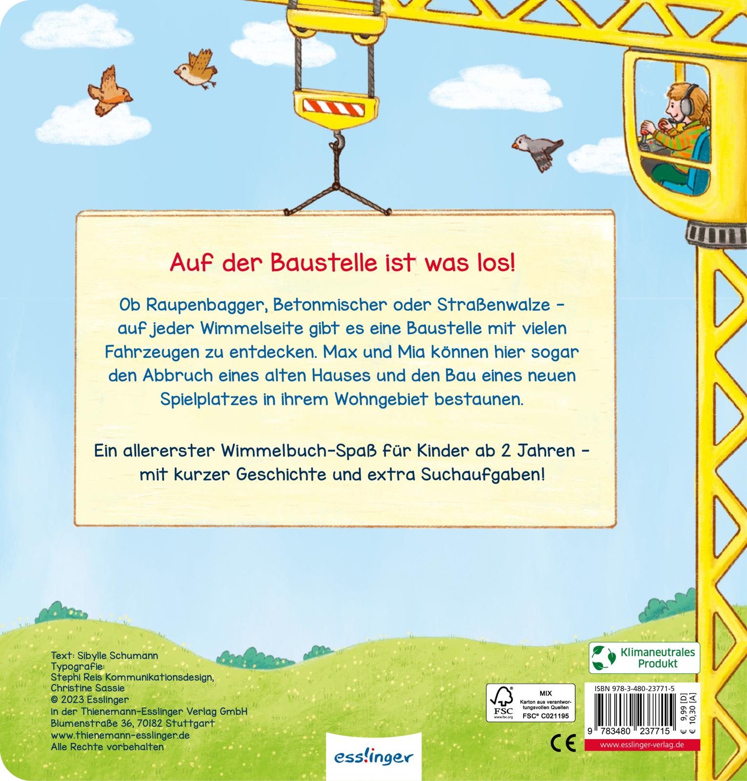 In diesem ersten Wimmelbuch sind Betonmischer, Bagger, Kranwagen, Straßenwalze und viele andere Baustellenfahrzeuge im Einsatz - in der Stadt, an der Straße, am Fluss und am Bahnhof, überall wird gebaut. Darüber freuen sich nicht alle Stadtbewohner, aber Max und Mia umso mehr. Auf jeder Wimmelseite werden neue spannende Fahrzeuge und Werkzeuge gezeigt. Kleine Betrachter können hier sogar den Abbruch eines alten Hauses und den Bau eines Spielplatzes bestaunen.