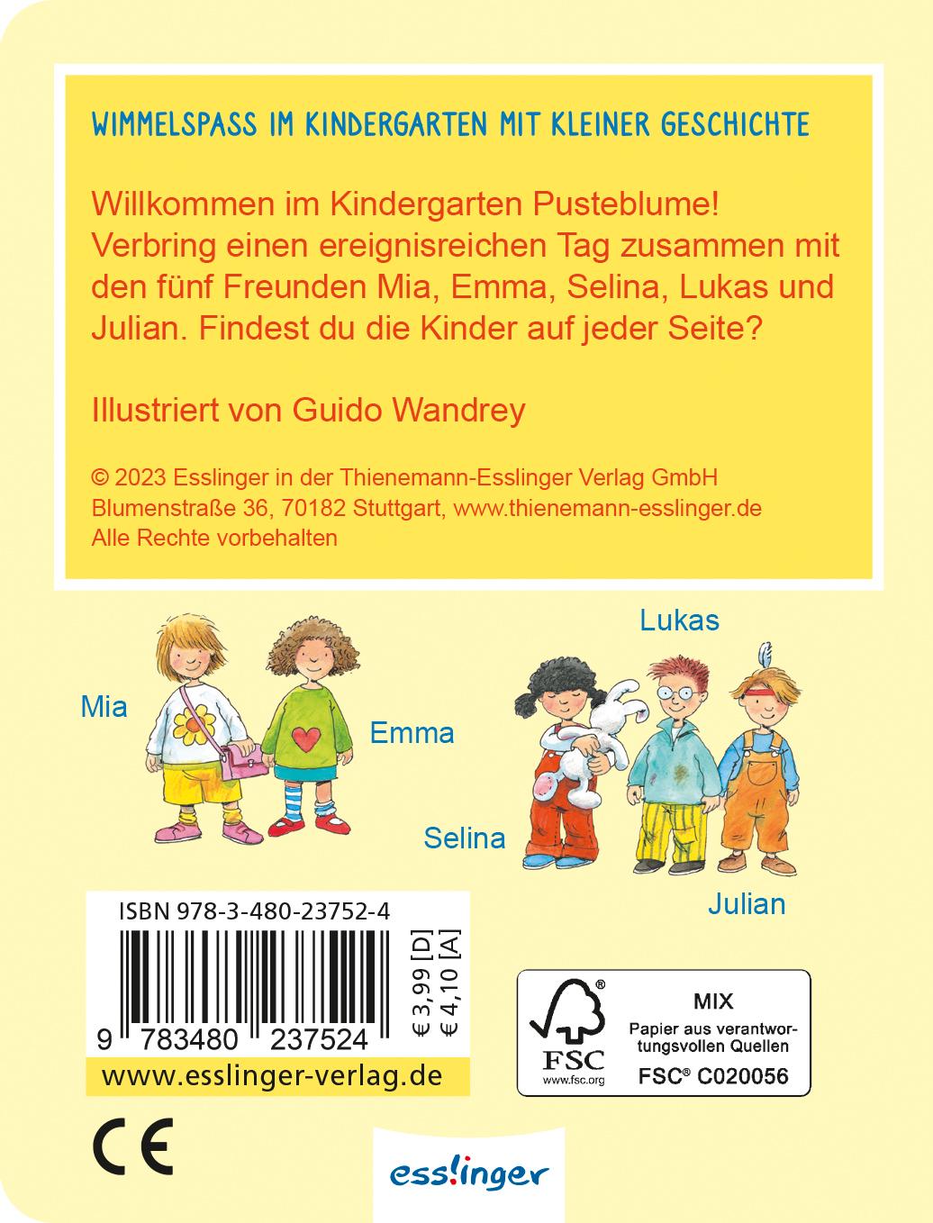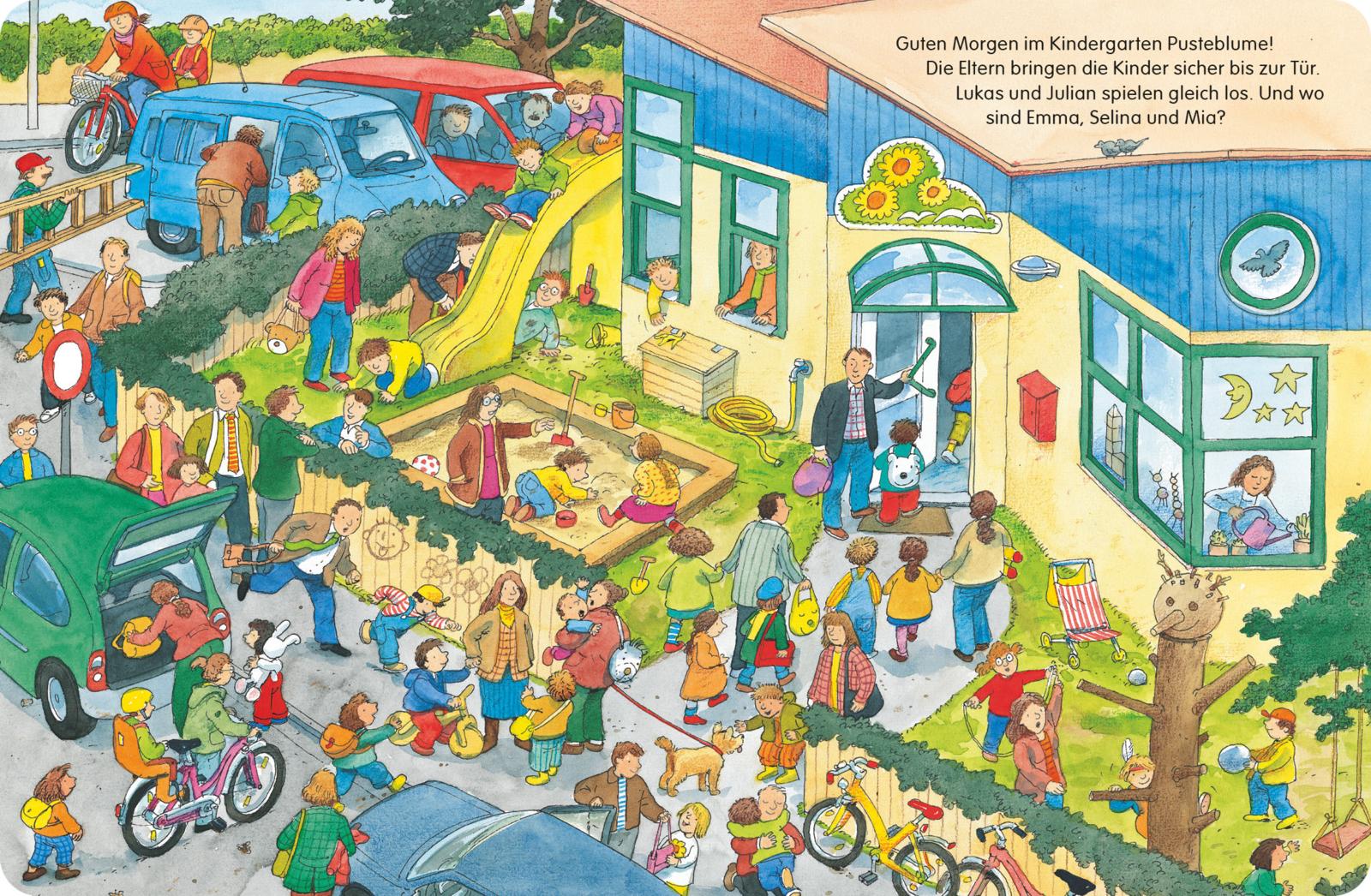 Wimmelspaß im Kindergarten, mit kleiner Geschichte und Suchaufgaben: Willkommen im Kindergarten Pusteblume! Die Freunde Mia, Emma, Selina, Lukas und Julian erleben einen ereignisreichen Kindergartentag, sogar mit einem Ausflug auf einen Bauernhof. Und wer findet die fünf Kinder auf jeder Seite? Augen auf und los!