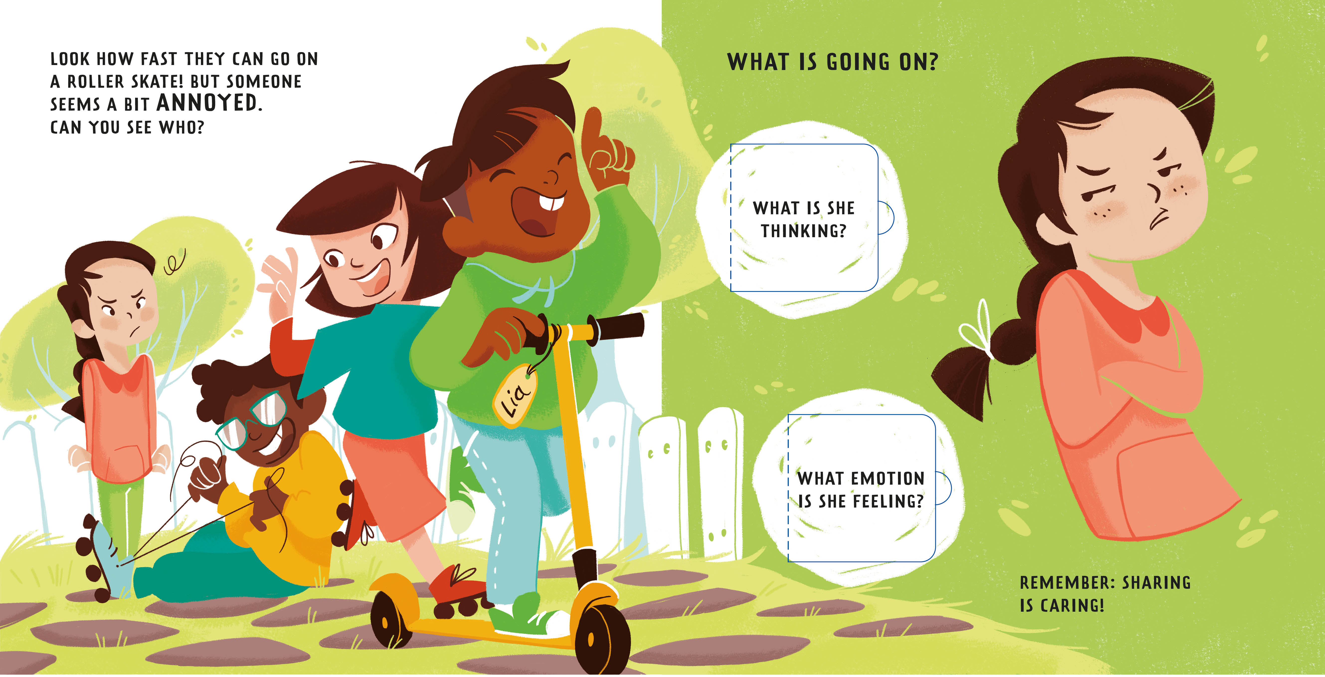 LUMI ist eine neue pädagogische Reihe, die anregend wirkt und ganzheitliches Wachstum über 7 Kompetenzen hinweg unterstützt. Die Produkte wollen den Geist von Kindern und Eltern zu einem besseren Verständnis der logischen, sozialen und emotionalen Intelligenz anregen. LUMI dient als langfristiges Referenzmaterial für Familien in einer globalen, vernetzten und interkulturellen Welt. Drei Freunde feiern eine Geburtstagsparty. Da ist es laut und lustig und glückliche Kinder hüpfen herum. Schaut man genau hin, sieht man ein kleines Mädchen, das sich scheu versteckt und einen Jungen, der gleich vor Wut platzen wird. Unter der Oberfläche brodeln in diesem Bilderbuch viele verborgene Emotionen. Wie damit umgehen? Die farbenfrohen Illustrationen sind so deutlich gestaltet, dass junge Leser die Gefühle sofort interpretieren können: Ein Blick auf das Gesicht des Protagonisten genügt. Die Kids lernen, Gemütszustände und Körpersprache richtig zu deuten. Das fördert die Entwicklung von Selbstwertgefühl und Empathie.