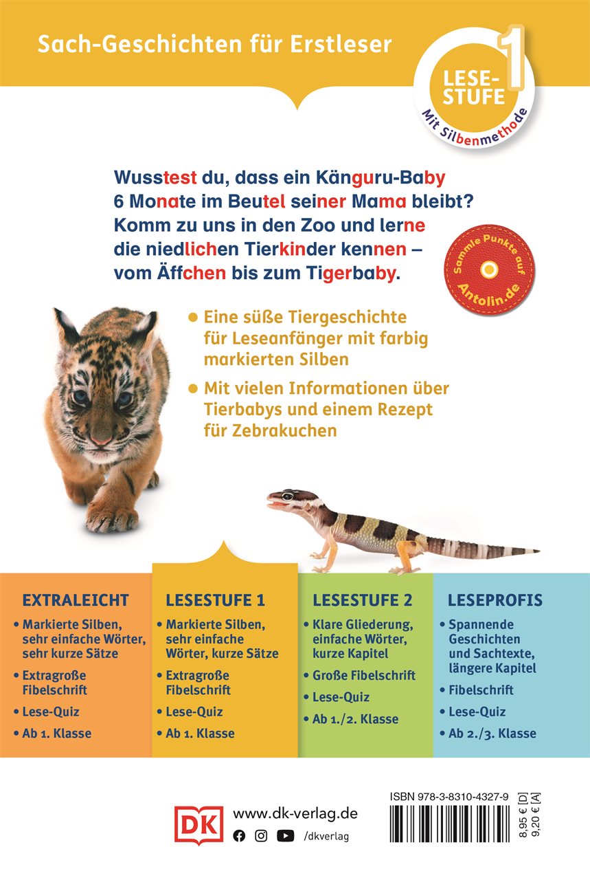Dieses Erstlesebuch über Tierbabys und Tierkinder im Zoo eignet sich mit kurzen Sätzen, einfacher Sprache und extra großer Fibelschrift perfekt zur Leseförderung. Farbig markierte Silben, ein praktisches Lesebändchen und ein übersichtliches Glossar zum Nachschlagen der Wörter erleichtern das Lesenlernen - und mit dem Mix aus fesselnder Erzählung, spannendem Sachwissen zu Tierkindern im Zoo und kreativen Extras wie dem Backrezept für einen leckeren Zebrakuchen macht Lesen üben gleich dreimal so viel Spaß!