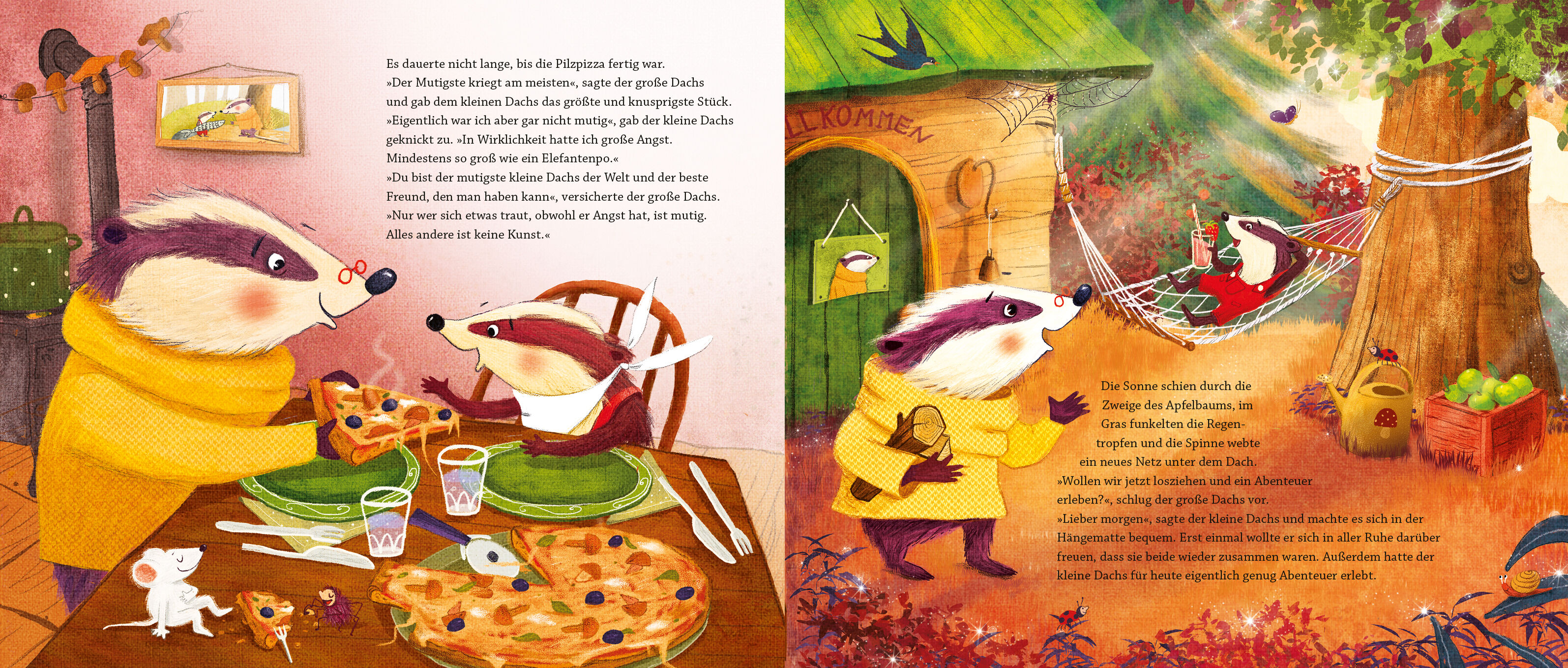 Oje! Der große Dachs ist verschwunden! Nirgends kann der kleine Dachs ihn entdecken. Ob ihn wohl ein Wildschwein vertrieben hat? Oder sogar eine Räuberbande? Obwohl sich der kleine Dachs ein bisschen fürchtet, beschließt er gleich: Er wird seinen allerbesten Freund retten! Selbst dunkle Höhlen oder unheimliche Schatten können ihn nicht davon abhalten. Und mit jedem Schritt auf der Suche nach dem großen Dachs wird der kleine Dachs mutiger und mutiger und seine Angst fast winzig klein ...