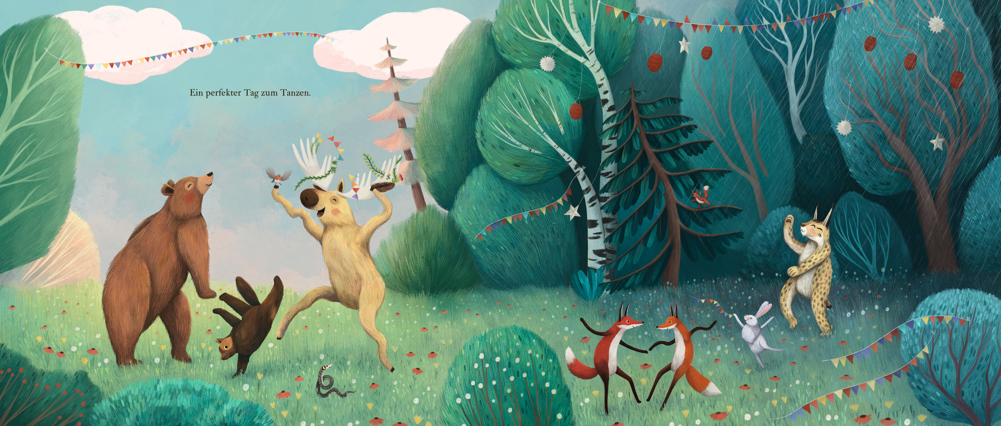 »Schwungvolle, farbenfrohe Illustrationen setzen den […] frohgemuten Helden und seine (tanzmuffeligen) Waldmitbewohner wunderbar in’s Bild.«