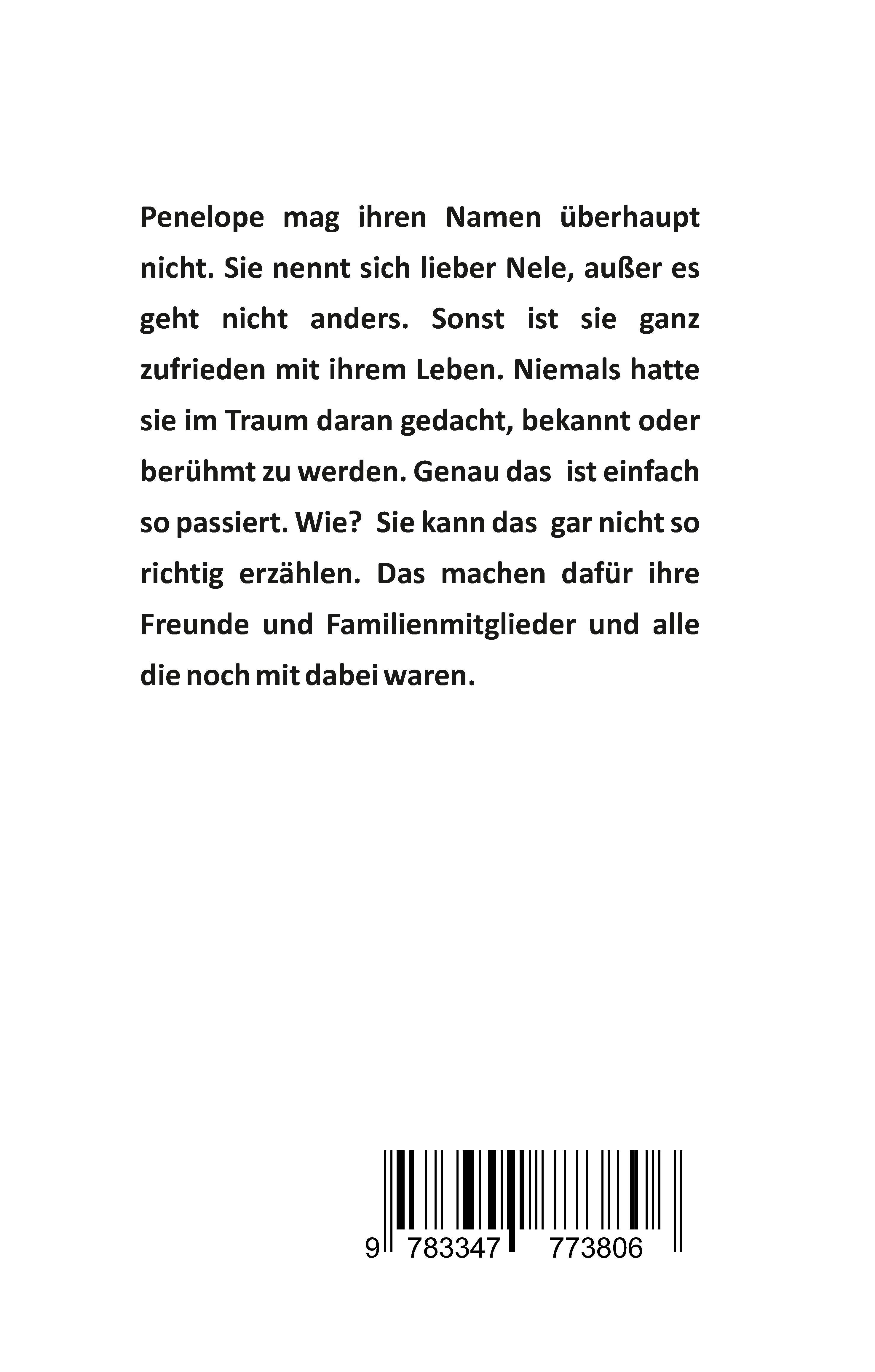Penelope mag ihren Namen überhaupt nicht. Sie nennt sich lieber Nele, außer es geht nicht anders. Sonst ist sie ganz zufrieden mit ihrem Leben. Niemals hatte sie im Traum daran gedacht, bekannt oder berühmt zu werden. Genau das ist einfach so passiert. Wie? Sie kann das gar nicht so richtig erzählen. Das machen dafür ihre Freunde und Familienmitglieder und alle die noch mit dabei waren.