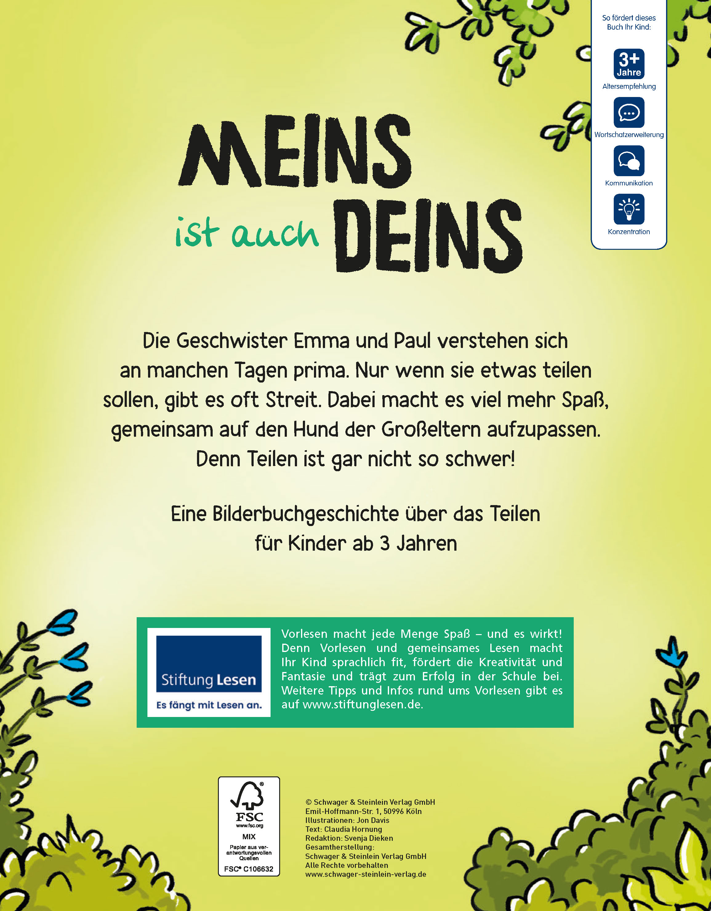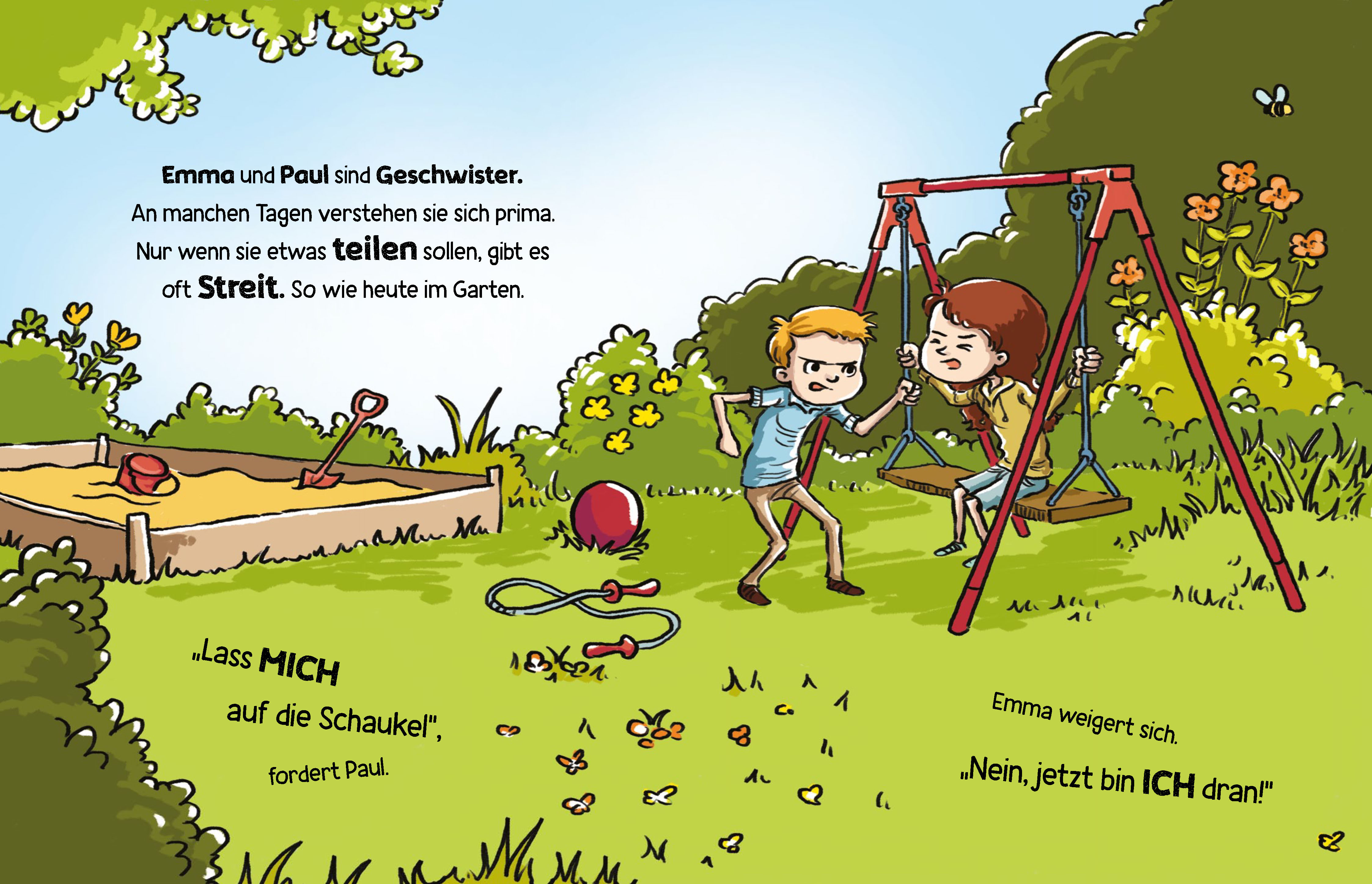 Emma und Paul sind Geschwister. Sie mögen sich gern, doch sobald sie etwas teilen müssen, streiten sie sich: Wer darf auf die Schaukel? Wer bekommt das Spielzeug? Oder wer darf den letzten Muffin essen? Als ihre Großeltern mit dem süßen Hund Schnuffel zu Besuch kommen, bemerken Emma und Paul, wie wichtig es ist miteinander zu teilen. Denn viele Dinge klappen viel besser, wenn man sich gegenseitig unterstützt.
