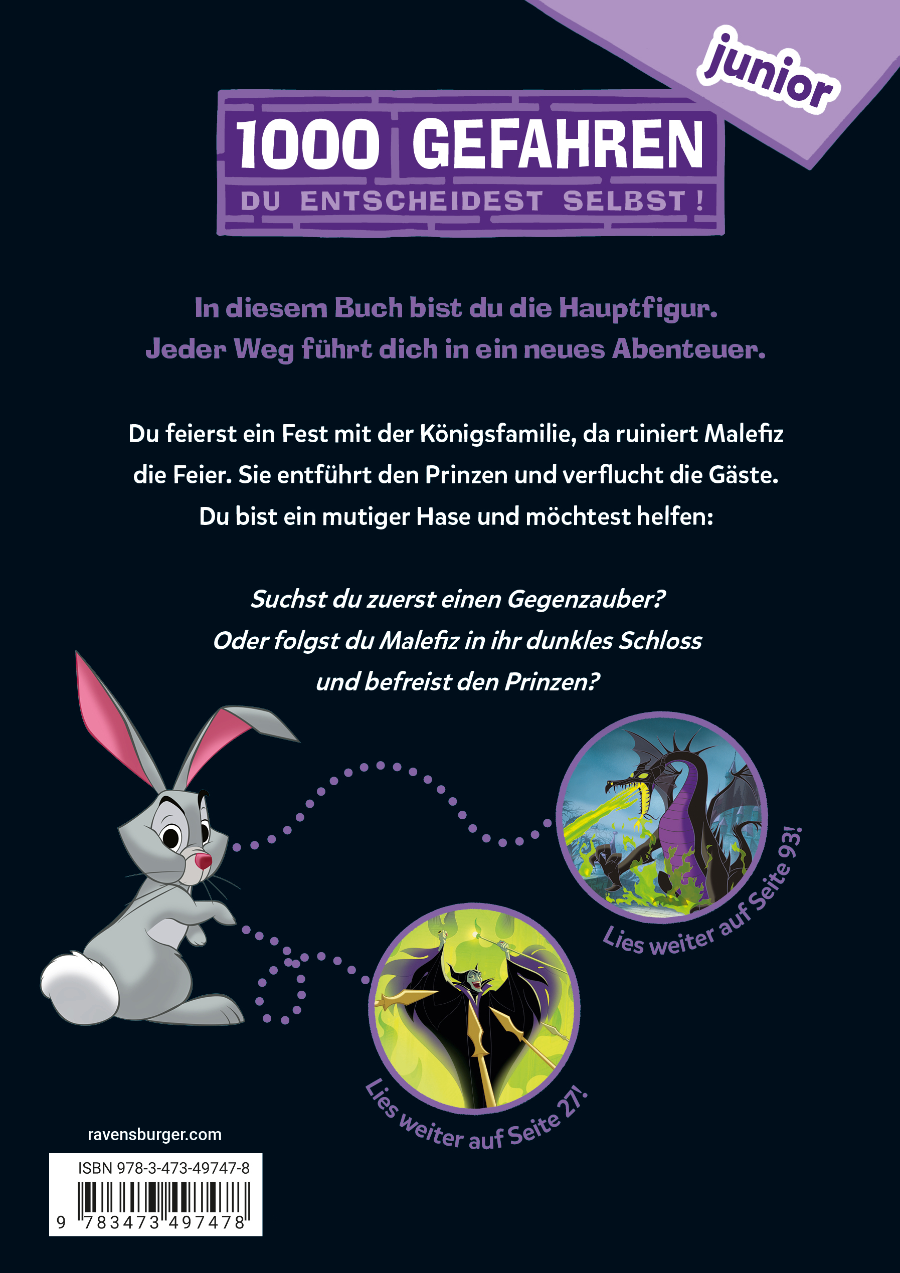 Jetzt bist du an der Reihe! Du bist die Hauptperson. Entscheide selbst, wie sich die Geschichte entwickelt. Die Königsfamilie gibt ein großes Fest im Schloss. Auch du bist eingeladen. Da sprengt ein ungeladener Gast die Party: Malefiz, die böse Fee! Sie entführt den Prinzen und verwandelt alle anderen Gäste in Stein. Jetzt liegt es an dir: Rettest du den Prinzen oder hilfst du zuerst den Leuten im Schloss? Wenn dich dein Weg zu Malefiz' düsterem Schloss führen soll, lies weiter auf Seite ...