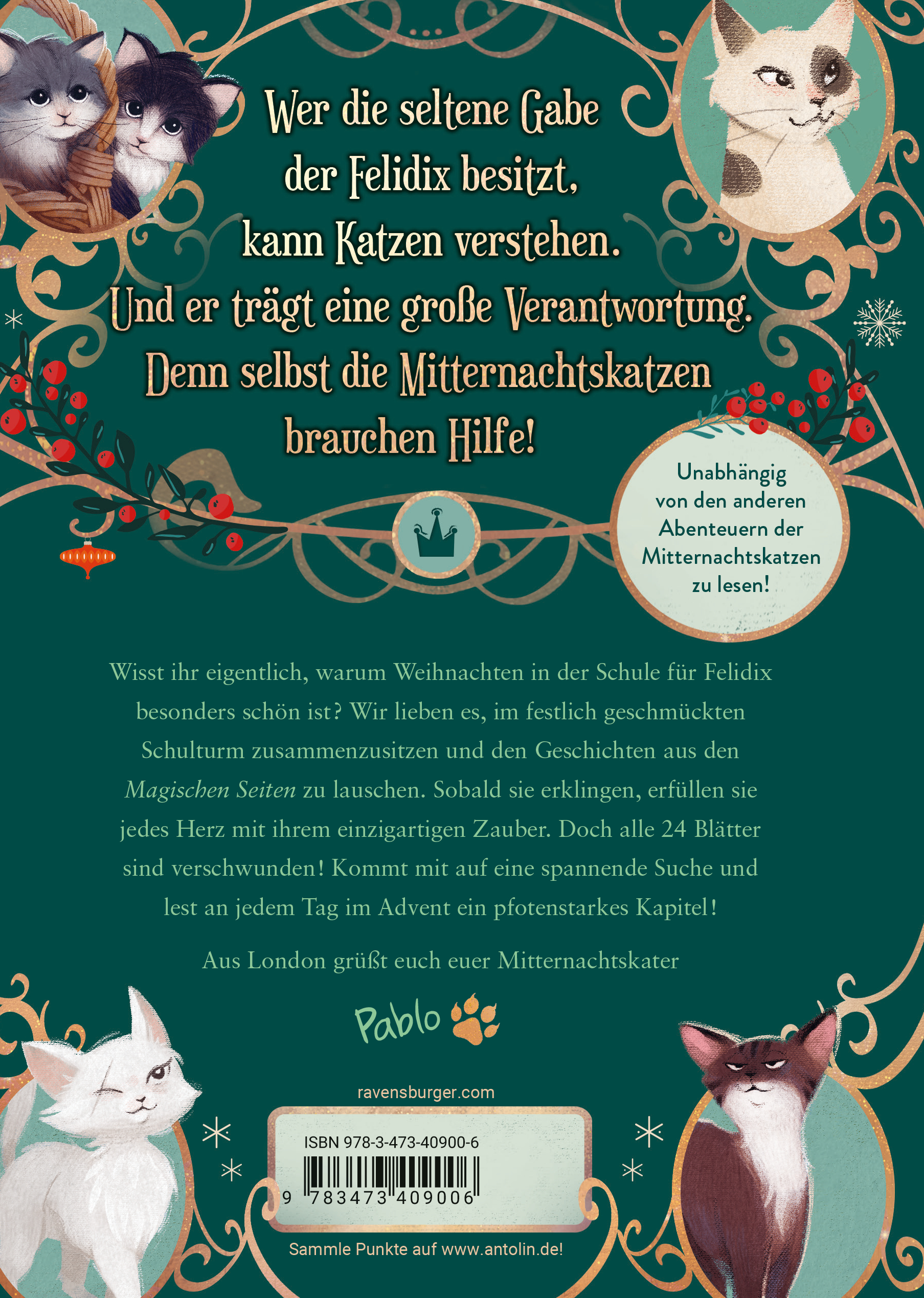 Weihnachten steht vor der Tür, und auf eine Tradition freuen sich Katzen und Felidix ganz besonders: im festlich geschmückten Schulturm zusammenzusitzen und den Geschichten aus den Magischen Seiten zu lauschen. Sobald sie erklingen, erfüllen sie jedes Herz mit ihrem einzigartigen Zauber. Doch alle 24 Blätter sind verschwunden! Wird es den Katzen gelingen, sie rechtzeitig wiederzufinden und das Weihnachtsfest zu retten?