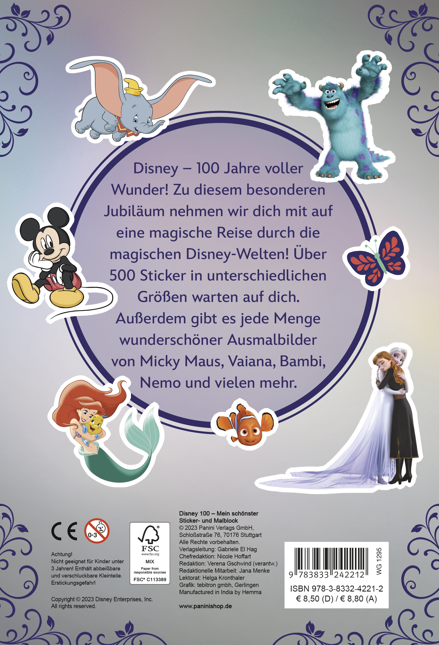 Disney - 100 Jahre voller Wunder! Zu diesem besonderen Jubiläum nehmen wir dich mit auf eine magische Reise durch die magischen Disney-Welten! Über 500 Sticker in unterschiedlichen Größen warten auf dich. Außerdem gibt es jede Menge wunderschöner Ausmalbilder von Micky Maus, Vaiana, Bambi, Nemo und vielen mehr.