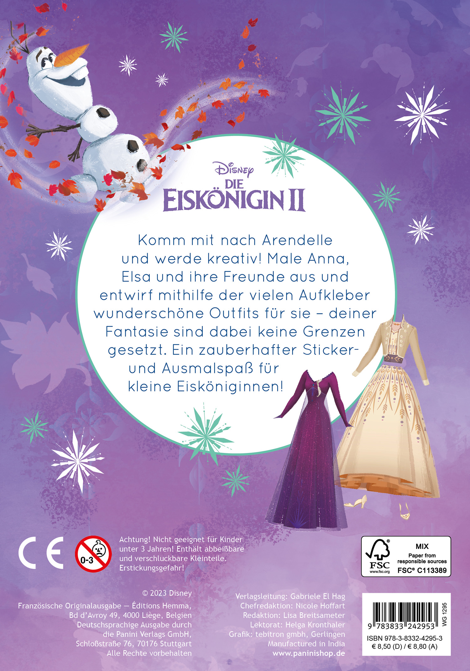 | Schlagworte | Ankleidepuppen • Anna • Anziehpuppen zum Kleben • Ausmalspaß • Disney Königin • Eiskönigin • Eiskönigin 2 • eLSA • f23 • FROZEN • Frozen 2 • Kinderbuch • Kinderbücher • Malblock • OUTFITS • Panini • PBK • Stickerblock • Stickerspaß • Styling-Spaß |