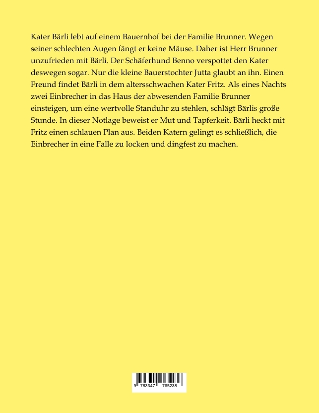 Kater Bärli lebt auf einem Bauernhof bei der Familie Brunner. Wegen seiner schlechten Augen fängt er keine Mäuse. Daher ist Herr Brunner unzufrieden mit Bärli. Der Schäferhund Benno verspottet den Kater deswegen sogar. Nur die kleine Bauerstochter Jutta glaubt an ihn. Einen Freund findet Bärli in dem altersschwachen Kater Fritz. Als eines Nachts zwei Einbrecher in das Haus der abwesenden Familie Brunner einsteigen, um eine wertvolle Standuhr zu stehlen, schlägt Bärlis große Stunde. In dieser Notlage beweist er Mut und Tapferkeit. Bärli heckt mit Fritz einen schlauen Plan aus. Beiden Katern gelingt es schließlich, die Einbrecher in eine Falle zu locken und dingfest zu machen.