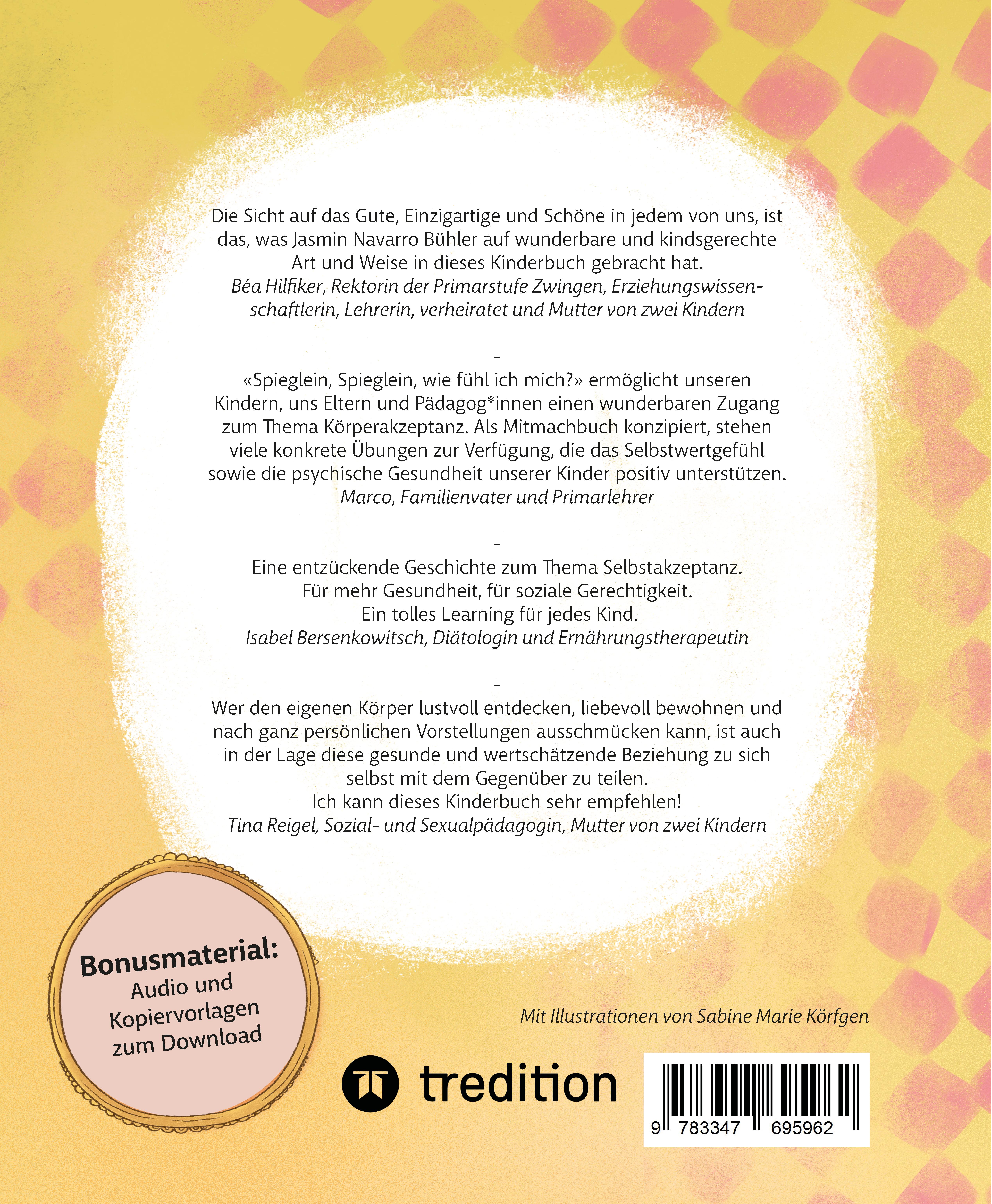 "Spieglein, Spieglein, wie fühl ich mich?" ermöglicht Kindern,Eltern und Pädagog*innen einen wunderbaren Zugang zu den ThemenKörperakzeptanz, psychische Gesundheit, Identität und Diversität. Ist es nicht so, dass wir in unserer Gesellschaft diesen "Spiegel" und diedamit verbundenen Gefühle nur allzu gut kennen? Dass Rollenbilderund Werbung uns täglich "vorleben", wie wir uns fühlen sollten, wie wiruns kleiden müssten und wie wir auszusehen haben? Wie aber könnenunsere Kinder in solchen Fragen einen gesunden Umgang mit sich undihrem Körper entwickeln?Jasmin Navarro Bühler bietet mit ihrem Buch einen wertvollen,kindgerechten und äußerst ansprechenden Zugang zu diesem wichtigenThema.