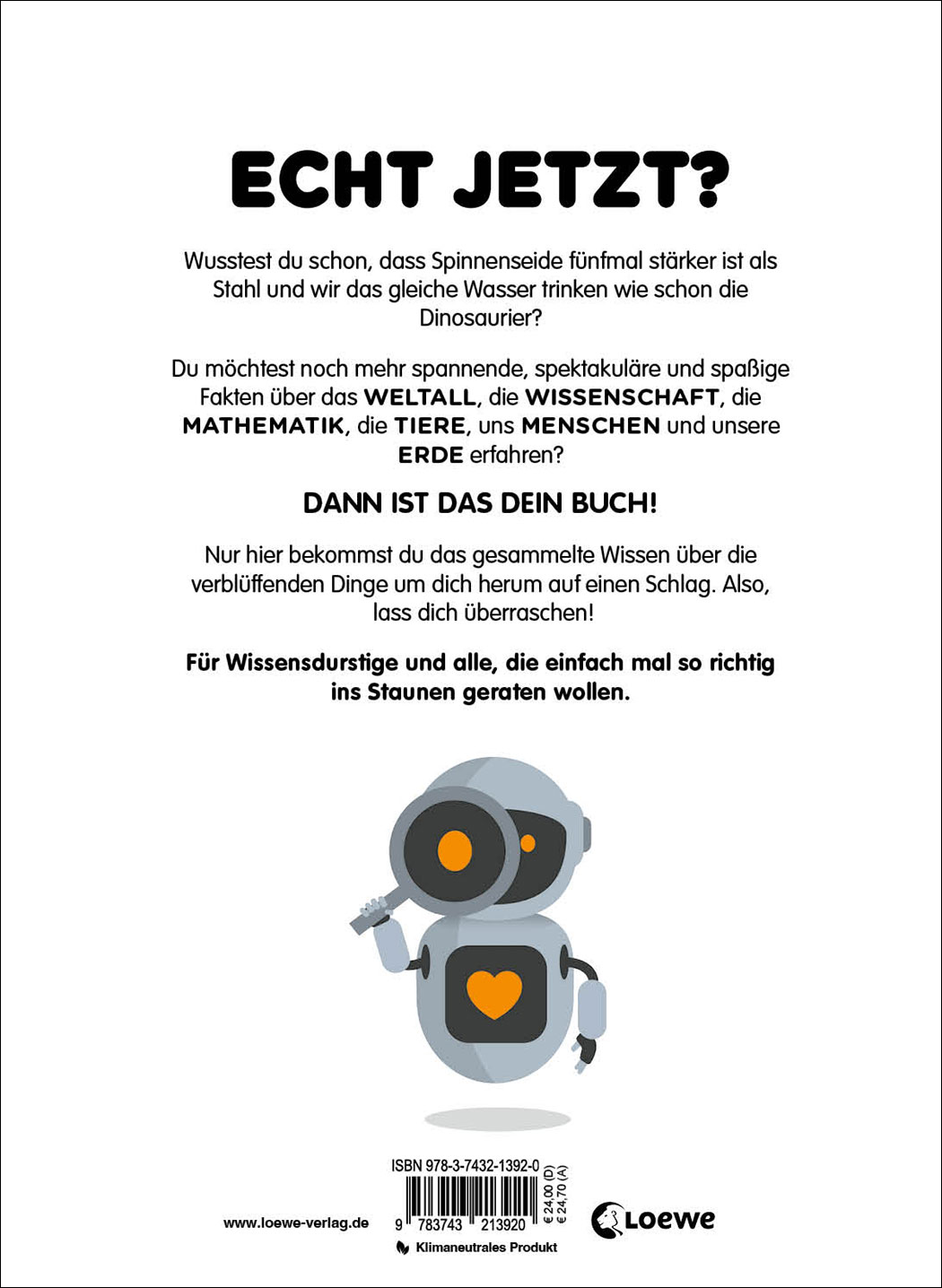 Wusstest du das? Spinnenseide ist fünfmal stärker als Stahl und unser Trinkwasser ist das gleiche wie das der Dinosaurier! Du möchtest noch mehr spannende, spektakuläre und spaßige Fakten über das Weltall, die Wissenschaft, die Mathematik, die Tiere, uns Menschen und unsere Erde erfahren? Dann ist das dein Buch! Nur hier bekommst du all das Wissen über die verblüffenden Dinge um dich herum auf einen Schlag. Also lass dich überraschen!