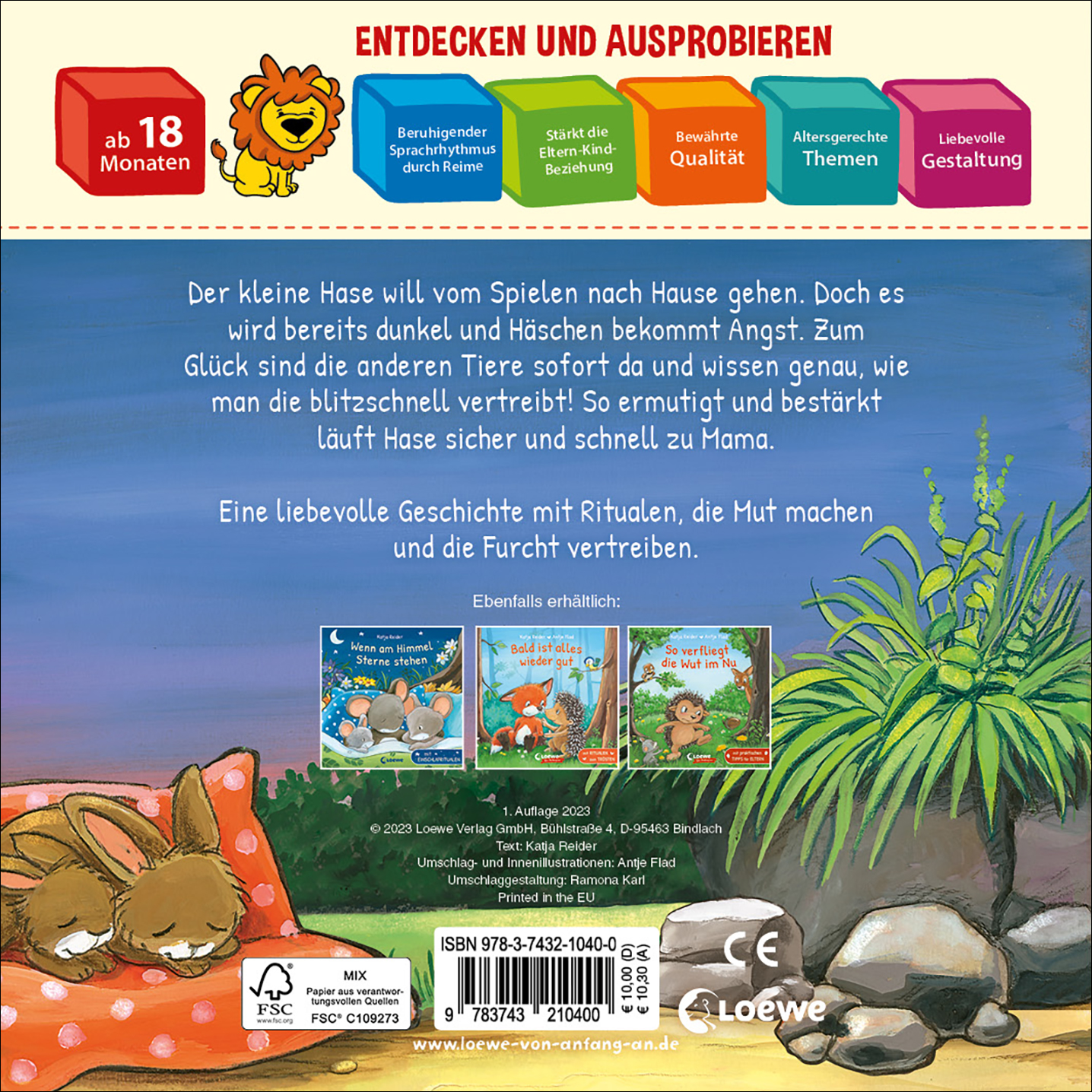 Der kleine Hase war lange auf dem Spielplatz. Doch als er nach Hause gehen will, beginnt es schon dunkel zu werden und Hase bekommt große Angst! Zum Glück wissen seine Freunde genau, wie die ganz schnell verschwindet: Reh bringt eine Lampe gegen die Dunkelheit, Bär hat einen Mutmach-Hut und Maus hüpft die Furcht einfach weg. So gestärkt gelangt Hase schnell zu Mama und kuschelt sich ganz eng an sie. Ein einfühlsames Pappbilderbuch über Angst und Mut - mit vielen Tipps für den Umgang mit zwei ganz großen Gefühlen.