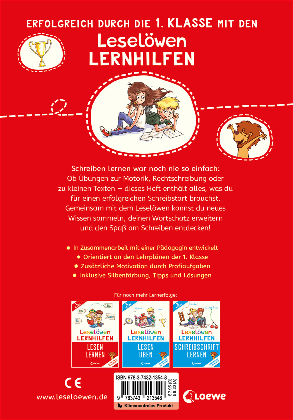 Seit über 45 Jahren unterstützen die Leselöwen Erstleser*innen beim Lesenlernen. Für die Leselöwen Lernhilfen haben wir gemeinsam mit erfahrenen Pädagog*innen hochwertige Lerninhalte entwickelt, die die Weichen für erfolgreiches Lesen und Schreiben stellen. Orientiert an den Lehrplänen der ersten und zweiten Klasse bieten die modern illustrierten Hefte zahlreiche Übungsmöglichkeiten - vom Lesen und Schreiben erster Buchstaben über die Verknüpfung einfacher Wörter mithilfe von Regeln und Strukturen der Schriftsprache bis hin zum Verständnis und Erstellen kleinerer Texte. Der steigende Schwierigkeitsgrad sowie die kniffligen Profiaufgaben und hilfreichen Tipps motivieren und fördern die Kinder auf unterhaltsame Weise. Eine perfekte Mischung aus Kompetenz und Kreativität, die Lernerfolge garantiert. Schreiben lernen war noch nie so einfach: Ob Übungen zur Motorik, Rechtschreibung oder zu kleineren Texten - dieses Heft enthält alles, was du für einen erfolgreichen Schreibstart brauchst. Gemeinsam mit dem Leselöwen kannst du neues Wissen sammeln, deinen Wortschatz erweitern und den Spaß am Schreiben entdecken!