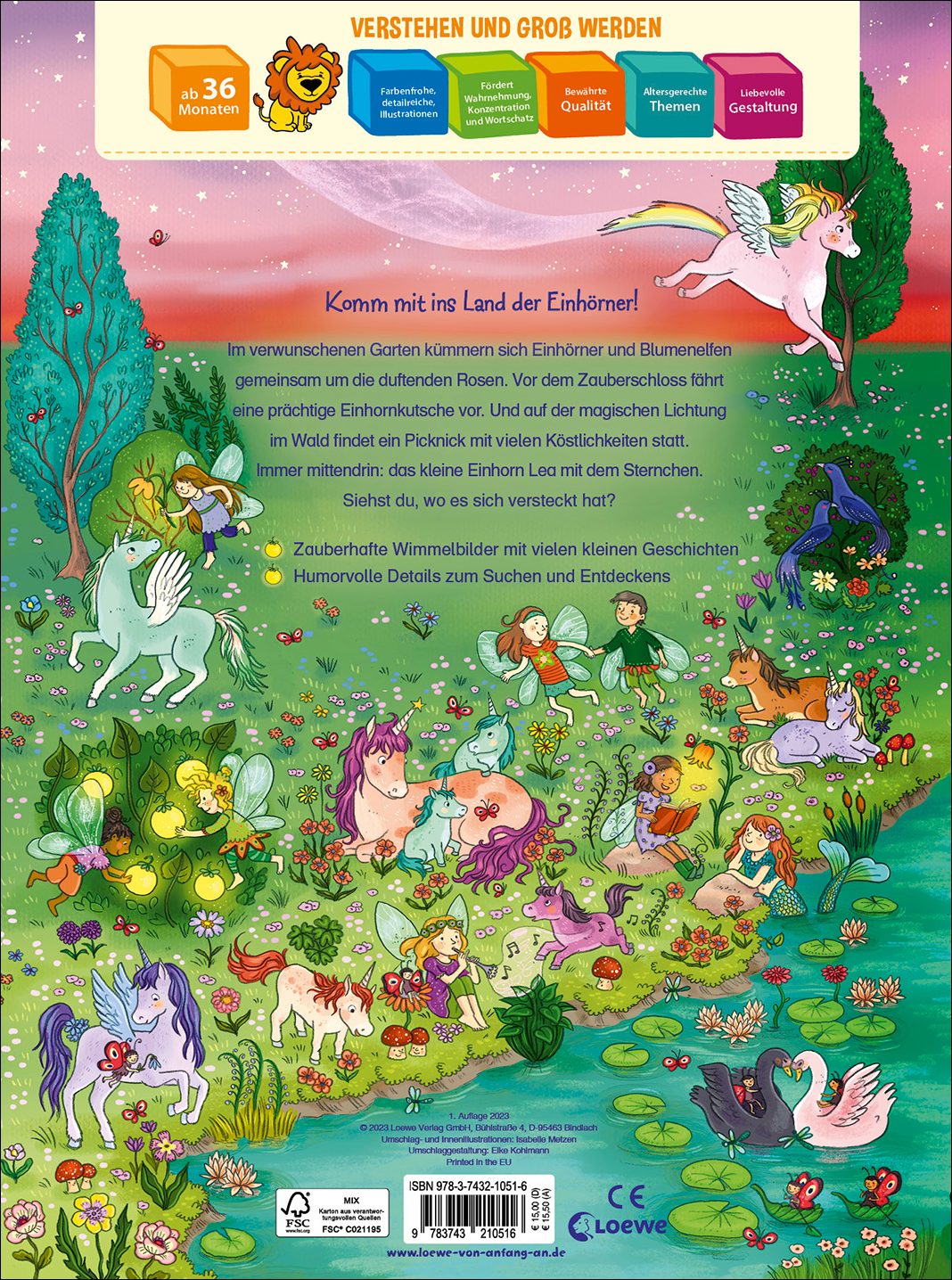 Im verwunschenen Garten kümmern sich Einhörner und Blumenelfen gemeinsam um die duftenden Rosen. Vor dem Zauberschloss fährt eine prächtige Einhornkutsche vor. Auf der magischen Lichtung im Wald findet ein Picknick mit vielen Köstlichkeiten statt. Immer mittendrin: das kleine Einhorn Lea mit dem Sternchen. Siehst du, wo es sich versteckt hat?
