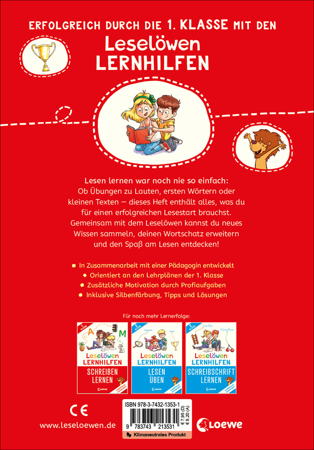 Seit über 45 Jahren unterstützen die Leselöwen Erstleser*innen beim Lesenlernen. Für die Leselöwen Lernhilfen haben wir gemeinsam mit erfahrenen Pädagog*innen hochwertige Lerninhalte entwickelt, die die Weichen für erfolgreiches Lesen und Schreiben stellen. Orientiert an den Lehrplänen der ersten und zweiten Klasse bieten die modern illustrierten Hefte zahlreiche Übungsmöglichkeiten - vom Lesen und Schreiben erster Buchstaben über die Verknüpfung einfacher Wörter mithilfe von Regeln und Strukturen der Schriftsprache bis hin zum Verständnis und Erstellen kleinerer Texte. Der steigende Schwierigkeitsgrad sowie die kniffligen Profiaufgaben und hilfreichen Tipps motivieren und fördern die Kinder auf unterhaltsame Weise. Eine perfekte Mischung aus Kompetenz und Kreativität, die Lernerfolge garantiert. Lesen lernen war noch nie so einfach: Ob Übungen zu Lauten, ersten Wörtern oder kleineren Texten - dieses Heft enthält alles, was du für einen erfolgreichen Lesestart brauchst. Gemeinsam mit dem Leselöwen kannst du neues Wissen sammeln, deinen Wortschatz erweitern und den Spaß am Lesen entdecken!
