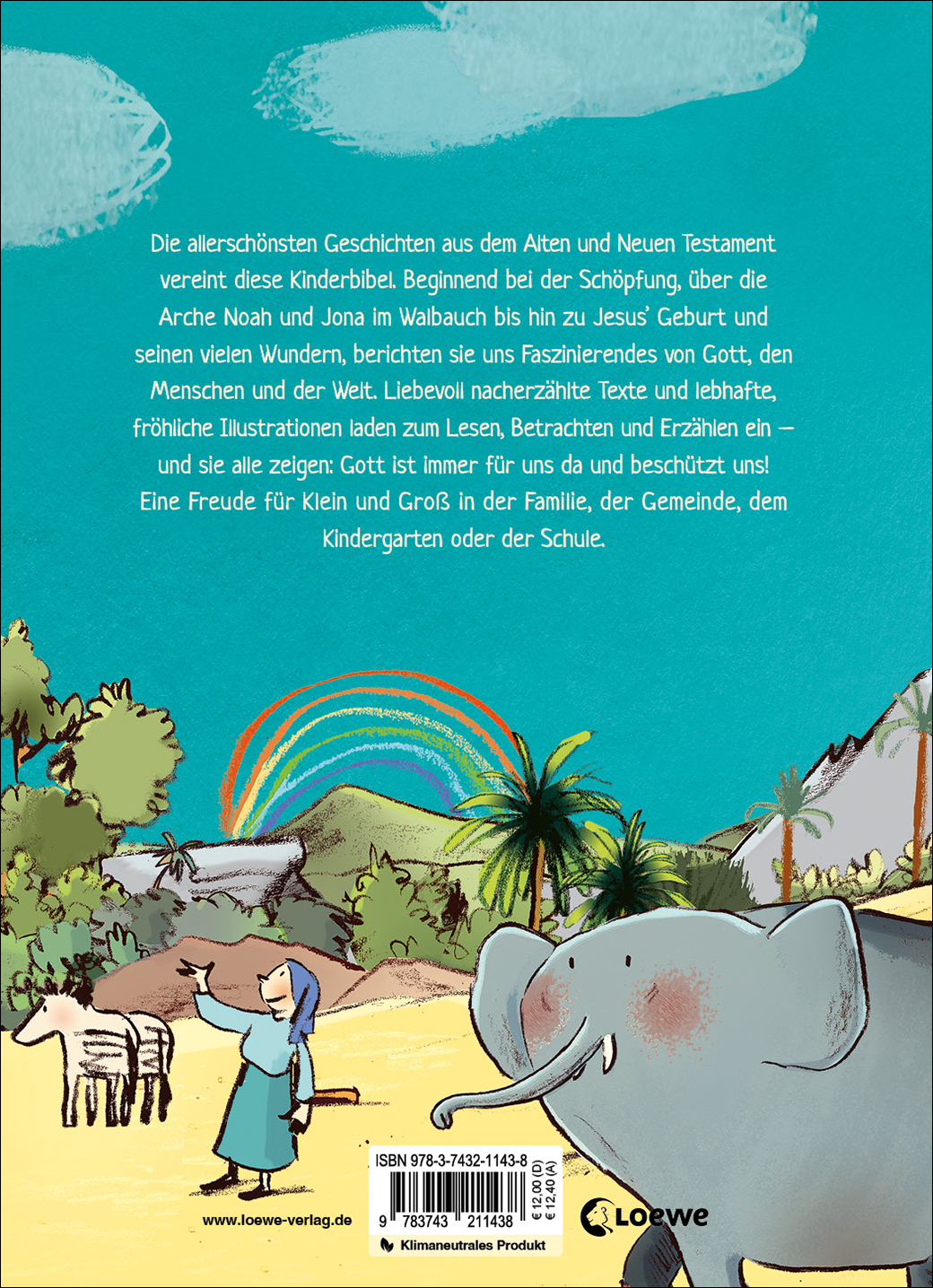 Die Geschichten aus der Bibel sind in vielen Familien noch immer Teil des Kinderalltags und helfen dabei, unsere Gesellschaft zu verstehen. Eine altersgemäße Vermittlung ist dabei entscheidend. Deshalb vereint diese Kinderbibel die schönsten und wichtigsten Texte aus dem Alten und Neuen Testament in liebevollen Nacherzählungen. Von der Erschaffung der Welt bis zu den Taten und Wundern Jesu berichtet sie von ganz viel Liebe, Zuversicht und großen und kleinen Ereignissen. Kombiniert mit stimmungsvollen Illustrationen, entsteht die ideale Grundlage für Vorlesestunden und Gespräche in der Familie, der Gemeinde oder Schule und Kindergarten.