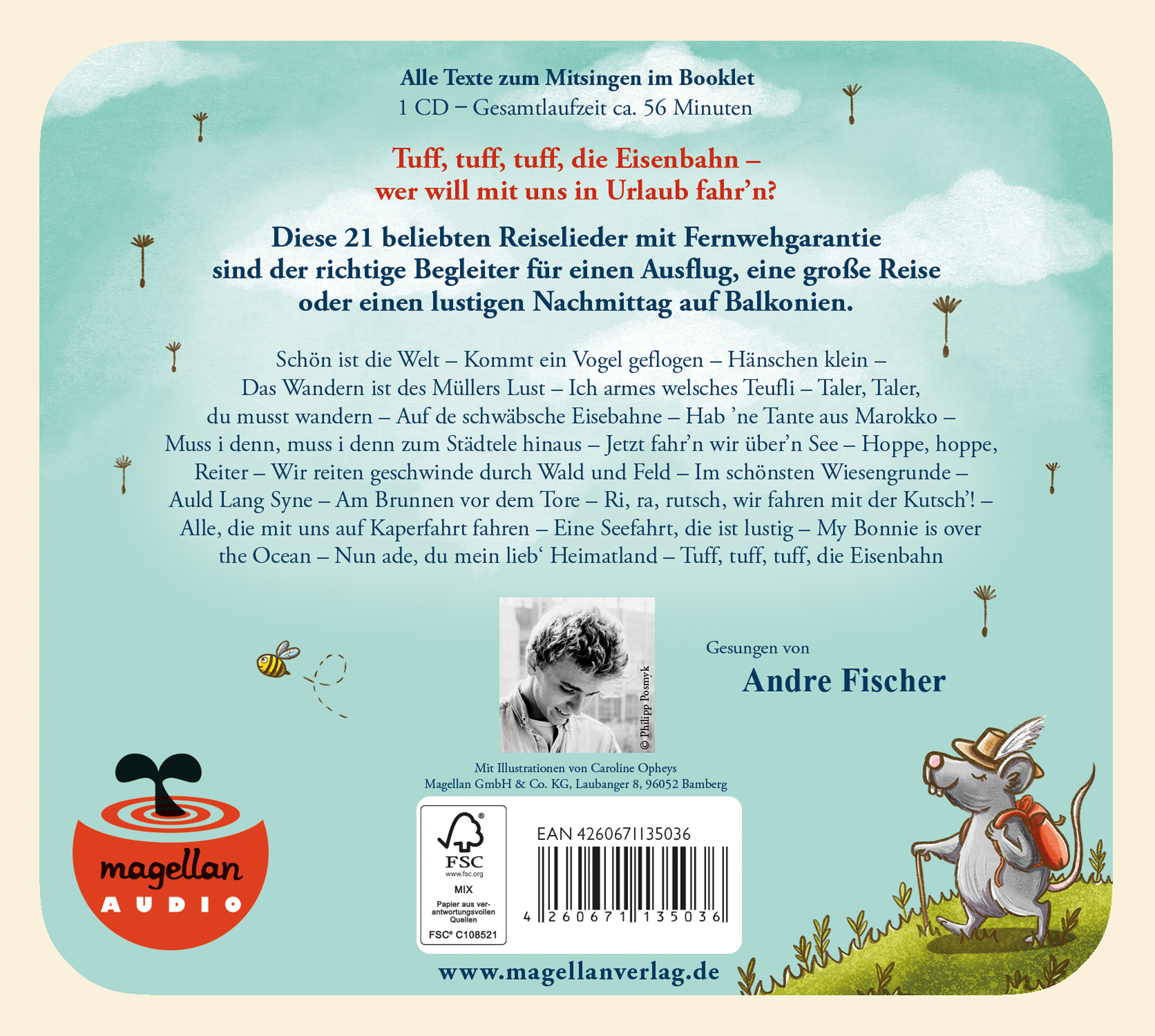 | Schlagworte | Das Wandern ist des Müllers Lust • Hab 'ne Tante aus Marokko • Kinderlieder • Liederbuch • Lieder-CD ab 12 Monaten • Lieder zu Festen und durch den Alltag • Liedtexte im Booklet • Reisezeit, Urlaub, Ferien • Singen, Tanzen, Springen, Bewegen • Singen und Musizieren mit Kindern • Tuff, tuff, tuff, die Eisenbahn |