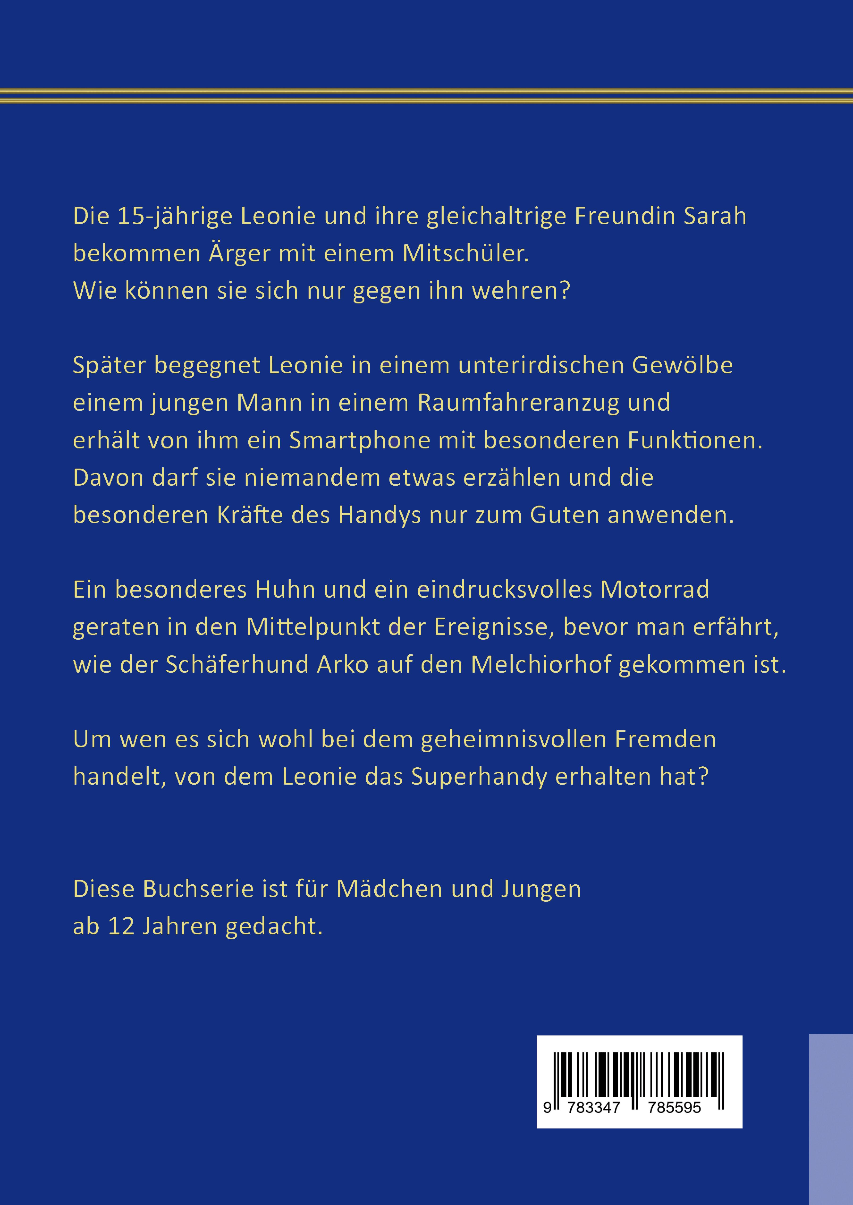 Mit viel Spannung und Humor wird die Geschichte der 15-jährigen Leonie erzählt, die zu ihrem Geburtstag einen Blumenstrauß mit einer geheimen Botschaft erhält. Die Nachricht führt sie in die bisher unbekannte Höhle eines Vulkanberges, wo sie einem jungen Mann im Raumfahreranzug begegnet und von ihm ein ganz besonderes Handy geschenkt erhält. Ein besonderes Huhn und ein eindrucksvolles Motorrad geraten in den Mittelpunkt der Ereignisse, bevor man erfährt, wie der Schäferhund Arko auf den Melchiorhof gekommen ist.Um wen es sich wohl bei dem geheimnisvollen Fremden handelt, von dem Leonie das Superhandy erhalten hat?Diese Buchserie ist für Mädchen und Jungen ab 12 Jahren gedacht.