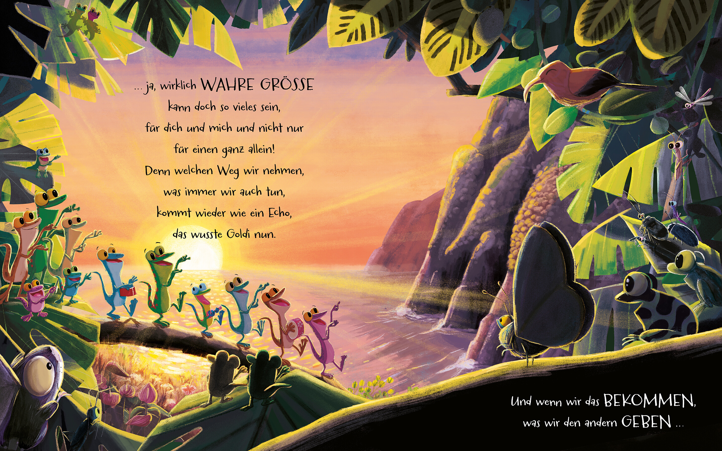 In einem fernen Inselparadies hat ein kleiner Gecko namens Goldi große Pläne. Er hält sich für etwas ganz Besonderes und bestimmt wird er einmal ein richtiger Star! Von früh bis spät und ohne Rücksicht auf andere, drängt Goldi sich gern in den Vordergrund. Bis er plötzlich allein dasteht und erkennt, dass sich nicht immer alles nur um ihn dreht. Vielleicht gibt es noch einen anderen Weg zum Glücklichsein?