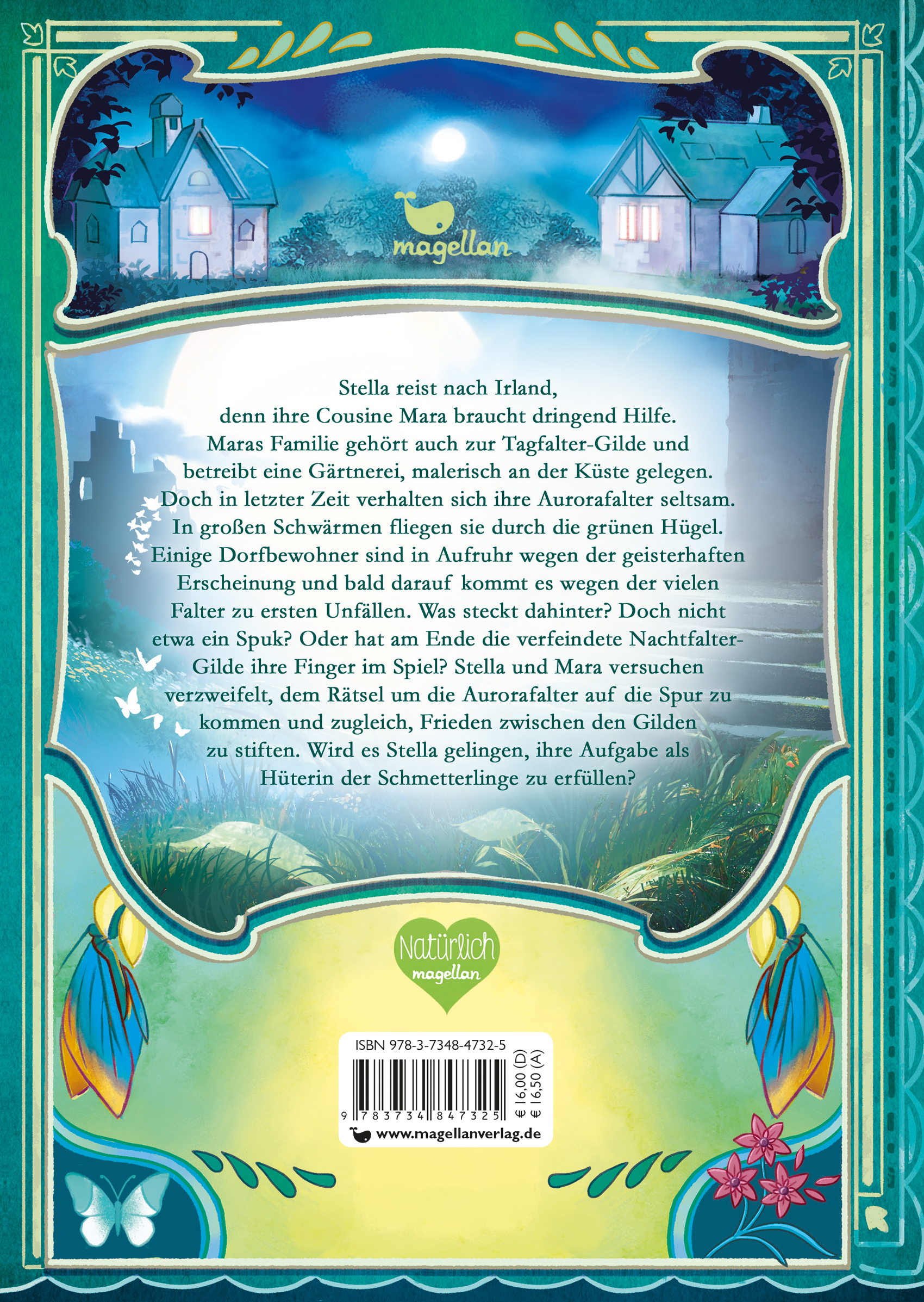 Stella reist nach Irland, denn ihre Cousine Mara braucht dringend Hilfe. Die Aurorafalter der Tagfalter-Gilde fliegen in großen Schwärmen durch die grünen Hügel, niemand weiß, was sie dazu veranlasst, sich so eigenartig zu verhalten. Aber nicht nur das: Die Dorfbewohner sind in Aufruhr wegen dieser geisterhaften Erscheinungen und drohen Maras Familie, wenn sie ihre Schmetterlinge nicht unter Kontrolle bringt. Ist es möglich, dass die Nachtfalter-Gilde hinter all dem steckt? Die Feindschaft zwischen den Gilden ist groß und schon lange will die Nachtfalter-Gilde Maras Familie loswerden. Wird es Stella gelingen, ihre Aufgabe als Hüterin der Schmetterlinge zu erfüllen, und nicht nur die Aurorafalter zu retten, sondern auch, endlich Frieden zwischen den Gilden zu schaffen? Dieses zauberhafte Kinderbuch entführt Mädchen und Jungs nach Irland und die magische Welt der Düfte. Feenzauber, Schmetterlinge und Abenteuer inklusive.