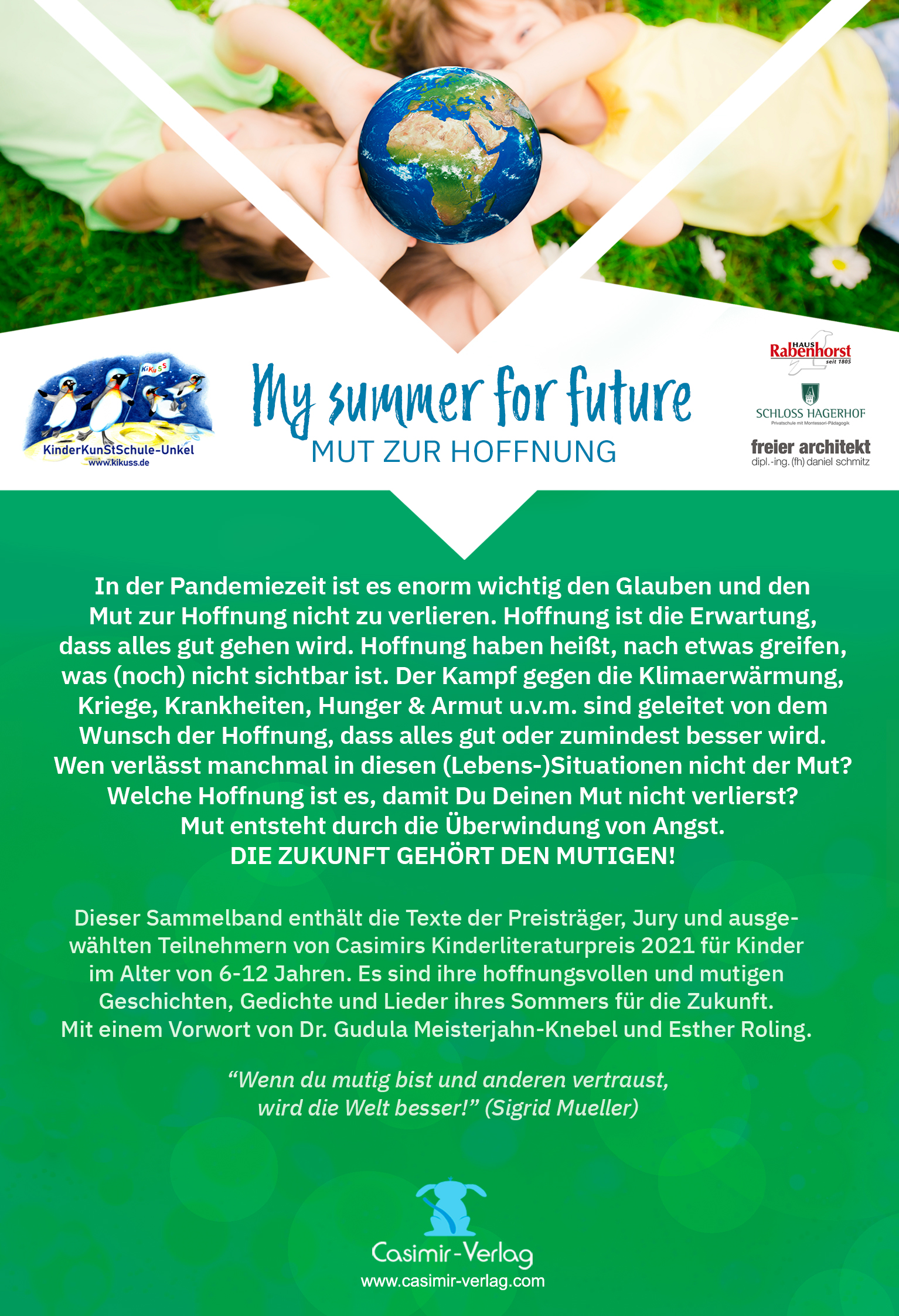 | Schlagworte | Carsten Krause • Casimir-Verlag • Christoph Biemann • kinderliteraturpreis • Mut zur Hoffnung • My summer for future • Sammelband |