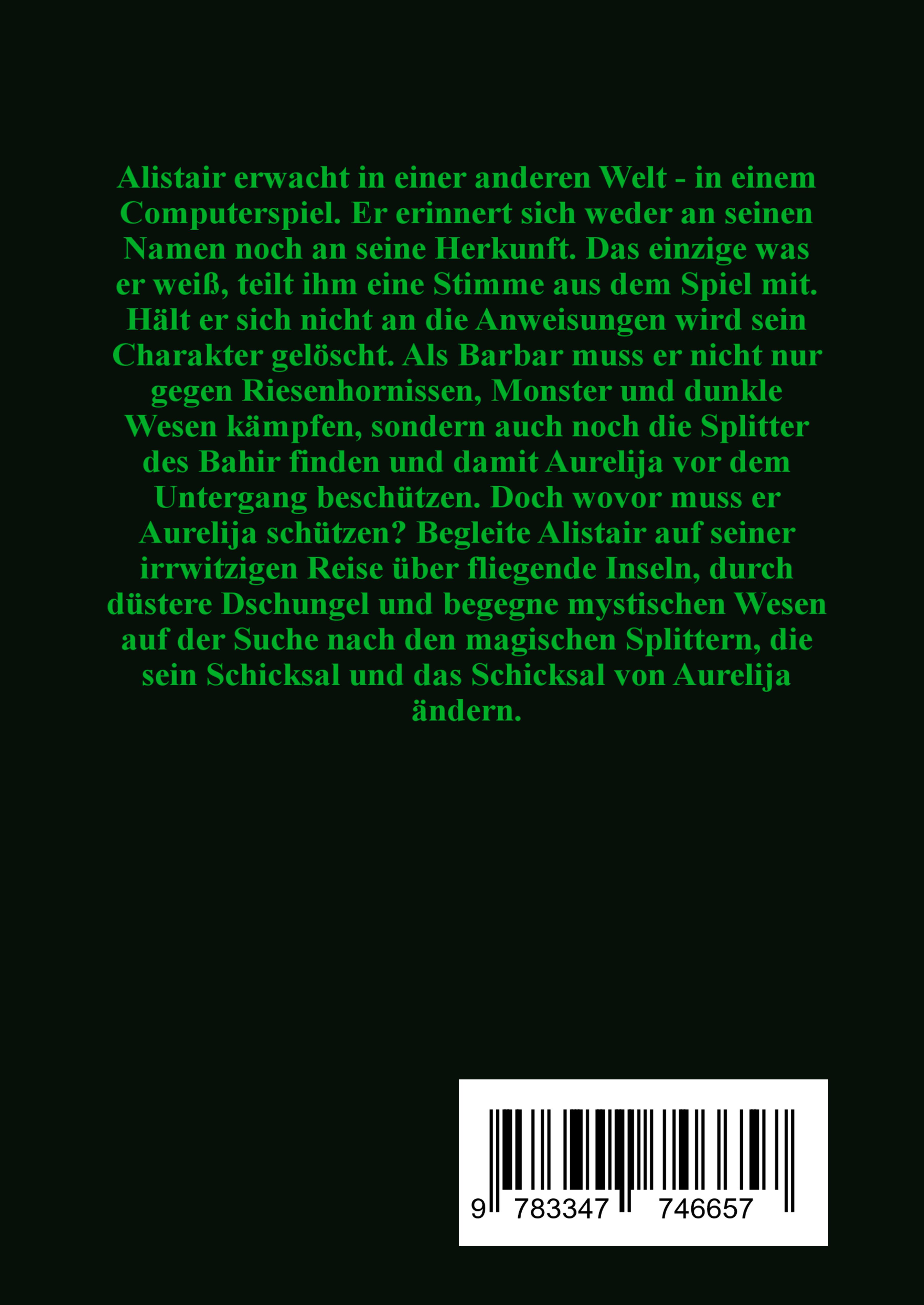 Alistair erinnert sich weder an seinen Namen noch an seine Herkunft, als er in einem Computerspiel aufwacht. Das einzige was er weiß, teilt ihm eine Stimme aus dem Spiel mit, die ihm auch noch droht ihn zu löschen, wenn er nicht mitspielt. Das Schlimmste ist auch noch, dass er ein Barbar ist und das will er gar nicht, er wäre viel lieber was anderes: Magier oder Ritter oder so. Also schlägt er sich mit seinem Status herum, mit Monstern und dann wird er auch noch in die Suche nach den Splittern des Bahir mitreingezogen. Eine Wahl hat er nicht wirklich, aber er kämpft sich so durch. Und dann hat er natürlich noch Probleme wie jeder andere in seinem Alter, aber versucht jede Situation möglichst "cool" zu lösen. Alistair ist ein wirklich liebenswerter Kerl, aber manchmal, naja, da denkt er nicht wirklich nach was er tut. Aber ich finde, das macht ihn so sympathisch und seine Geschichte so lesenswert.