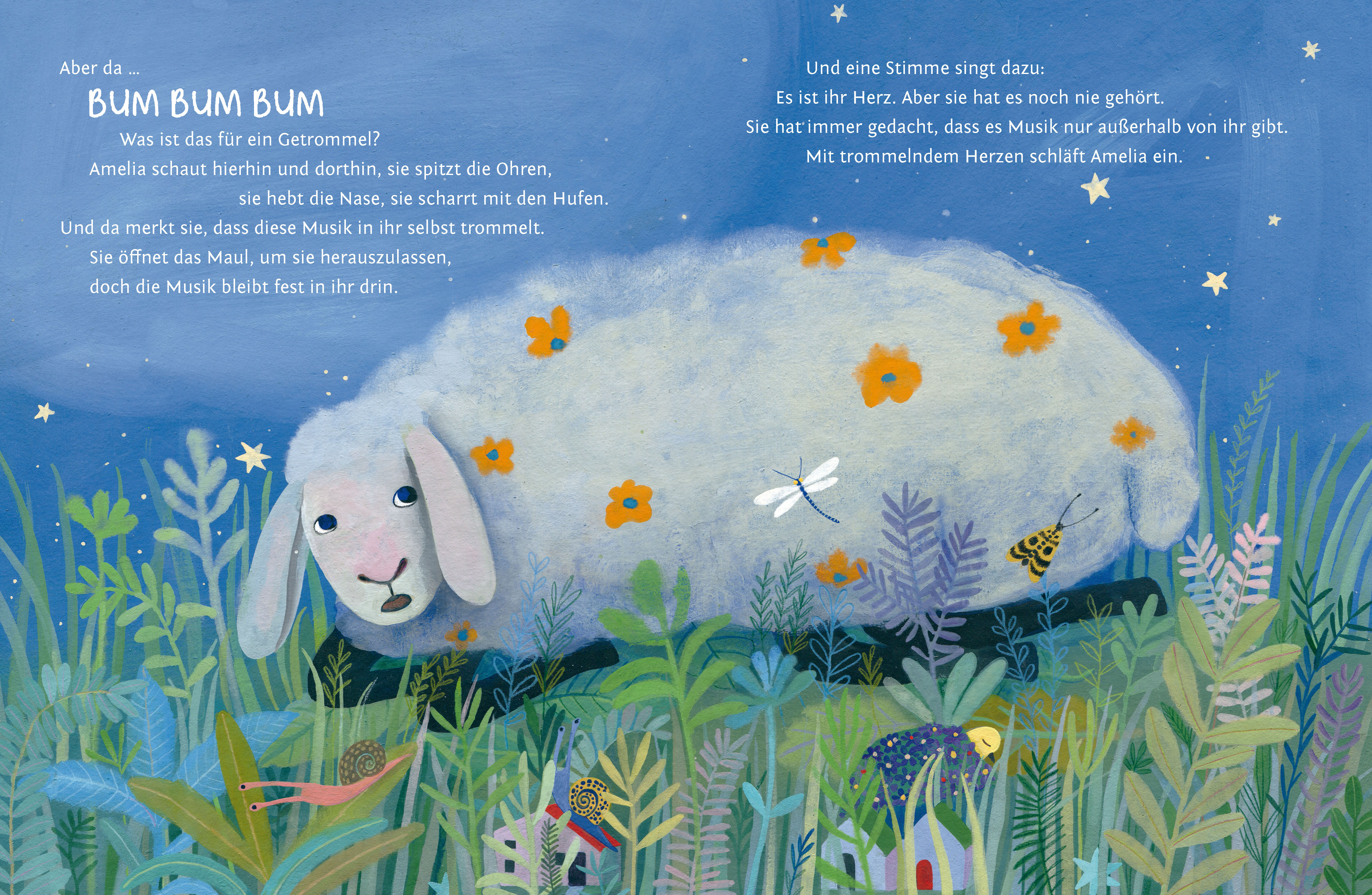 Tagein, tagaus trottet das brave Schaf Amelia der Herde hinterher. Frisst hier etwas, frisst dort etwas. Wenn es dunkel wird, trotten alle wieder zurück in den Stall. Doch eines Tages kommt Amelia zu spät und findet das Gatter verschlossen vor. Oje! Wie soll das ängstliche Schaf so ganz allein nur die dunkle Nacht überstehen?