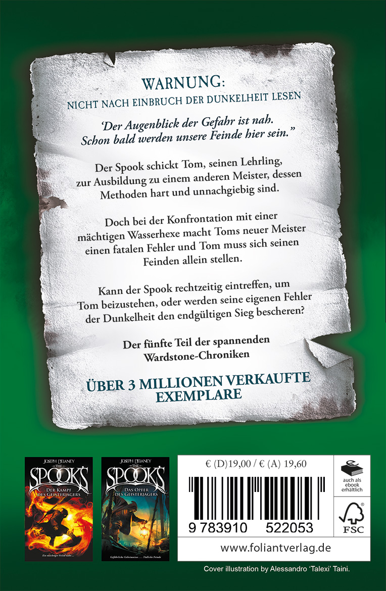 Bei der Konfrontation mit einer mächtigen und heimtückischen Wasserhexe unterläuft Meister Arkwright ein fataler Fehler. Plötzlich muss sich der junge Tom seinen Feinden ganz allein stellen. Kann der Spook rechtzeitig eintreffen, um seinen Lehrling vor dem Schlimmsten zu bewahren, oder werden Toms eigene Fehler und die der anderen der Dunkelheit den endgültigen Sieg bescheren? Joseph Delaney treibt die Dark Fantasy-Saga an ihren Höhepunkt der Einsamkeit und Konsequenz. Ein packendes Abenteuer, das dich nicht mehr loslassen wird.