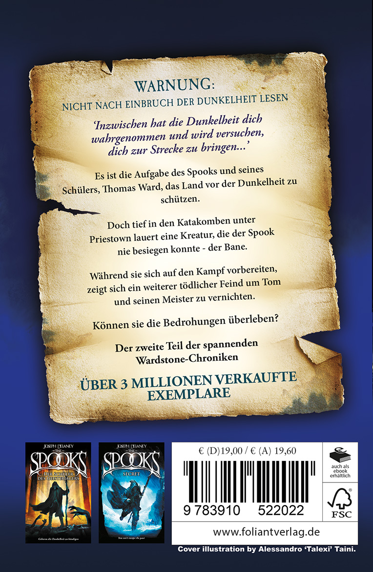 Nach den ersten Lektionen des grimmigen Geisterjägers John Gregory steht Toms wahre Feuerprobe bevor. Der zweite Band der legendären "Spook's"-Reihe taucht tiefer ein in die unversöhnliche Welt des Kampfes gegen das Böse. Tom findet sich zum ersten Mal allein einem blutrünstigen Boggart gegenüber. Doch diese Gefahr verblasst schnell, denn in den finsteren Gewölben unterhalb der Kathedrale von Priestown lauert der Bane - eine uralte, blutdürstige Kreatur, furchtbarer als jeder Dämon, den Tom bisher kannte. Der Geisterjäger und sein Lehrling müssen sich einem Grauen stellen, das die gesamte Region zu verschlingen droht.
