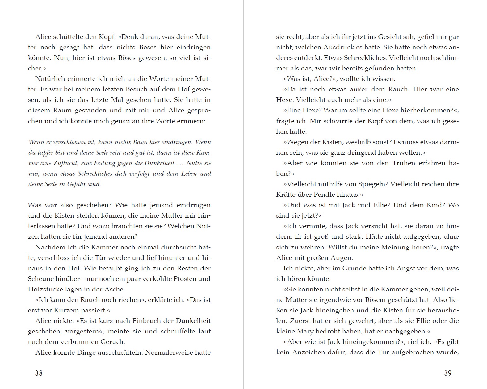 1. Ein Besucher aus Pendle2. Diebstahl und Entführung3. Prioritäten4. Ostwärts nach Pendle5. Die drei Schwestern6. Ein Keller voller Spiegel7. Alice' Geschichte8. Mistress Wurmalde9. Fußstapfen10. Tibb11. Dieb und Mörder12. Die Armee kommt13. Das Grab14. Der Wicht15. Wie geschmeidige Katzen16. Mamas Truhen17. Mondlicht18. James, der Schmied19. Agnes Sowerbutts20. Das Ende eines Feindes21. Zurück in Downham22. Die Schlacht am Pendle23. Blutmond24. Verzweiflung25. Eine neue OrdnungTagebuch von Thomas J. Ward