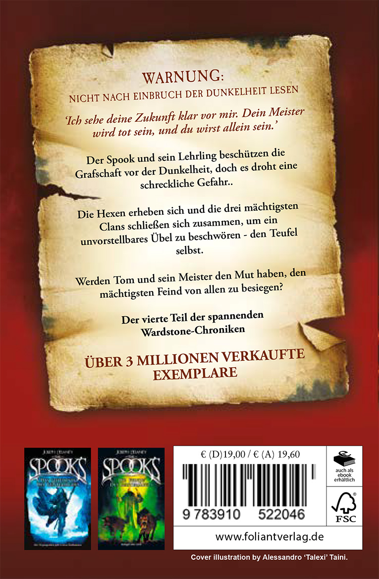 Die Lage im County spitzt sich zu. Eine uralte Prophezeiung spricht von der Ankunft des Fiend, der ultimativen Inkarnation des Bösen. Im vierten Band der "Spook's"-Reihe stehen Tom Ward, sein Meister John Gregory und die zwielichtige Hexe Alice vor ihrer größten Herausforderung. Die Mächte der Dunkelheit versammeln sich zu einem gigantischen Hexenkonklave, dessen Ziel die Entfesselung des Fiend ist - eine Katastrophe, die nicht nur das County, sondern die ganze Welt in den Abgrund reißen könnte.