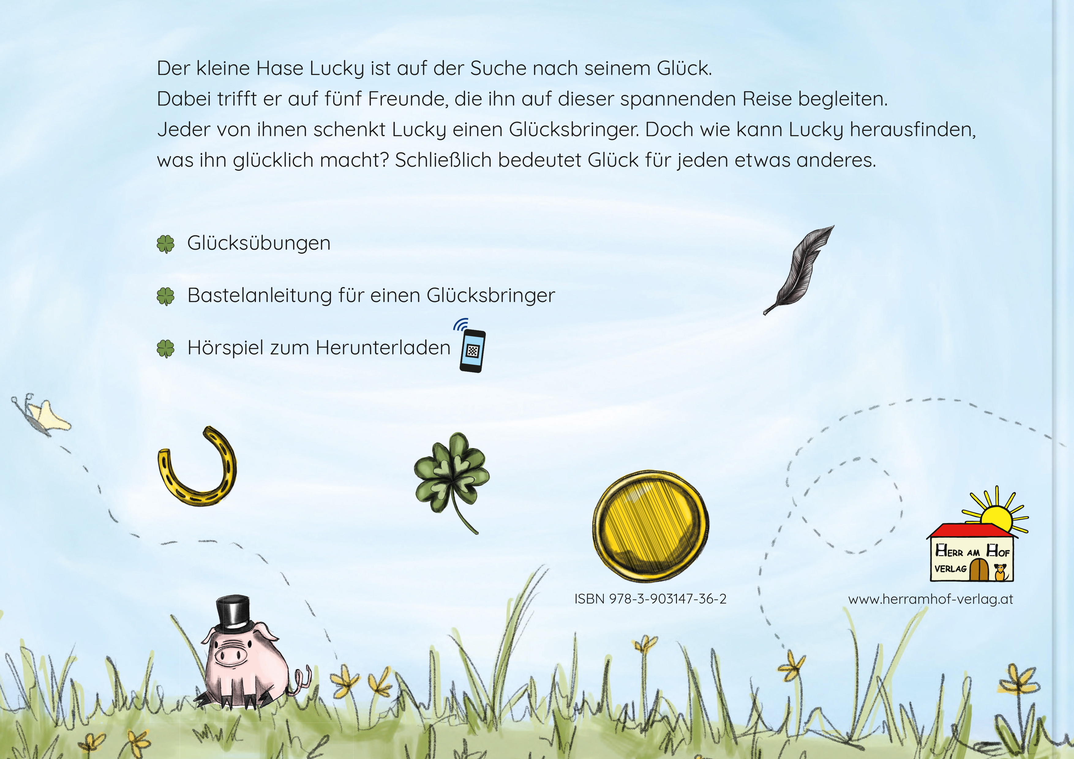 Der kleine Hase Lucky ist auf der Suche nach seinem Glück. Dabei trifft er auf fünf Freunde, die ihn auf dieser spannenden Reise begleiten. Jeder von ihnen schenkt Lucky einen Glücksbringer. Doch wie kann Lucky herausfinden, was ihn glücklich macht? Schließlich bedeutet Glück für jeden etwas anderes. Mit Glücksübungen, Bastelanleitung für einen Glücksbringer und Hörspiel zum Herunterladen