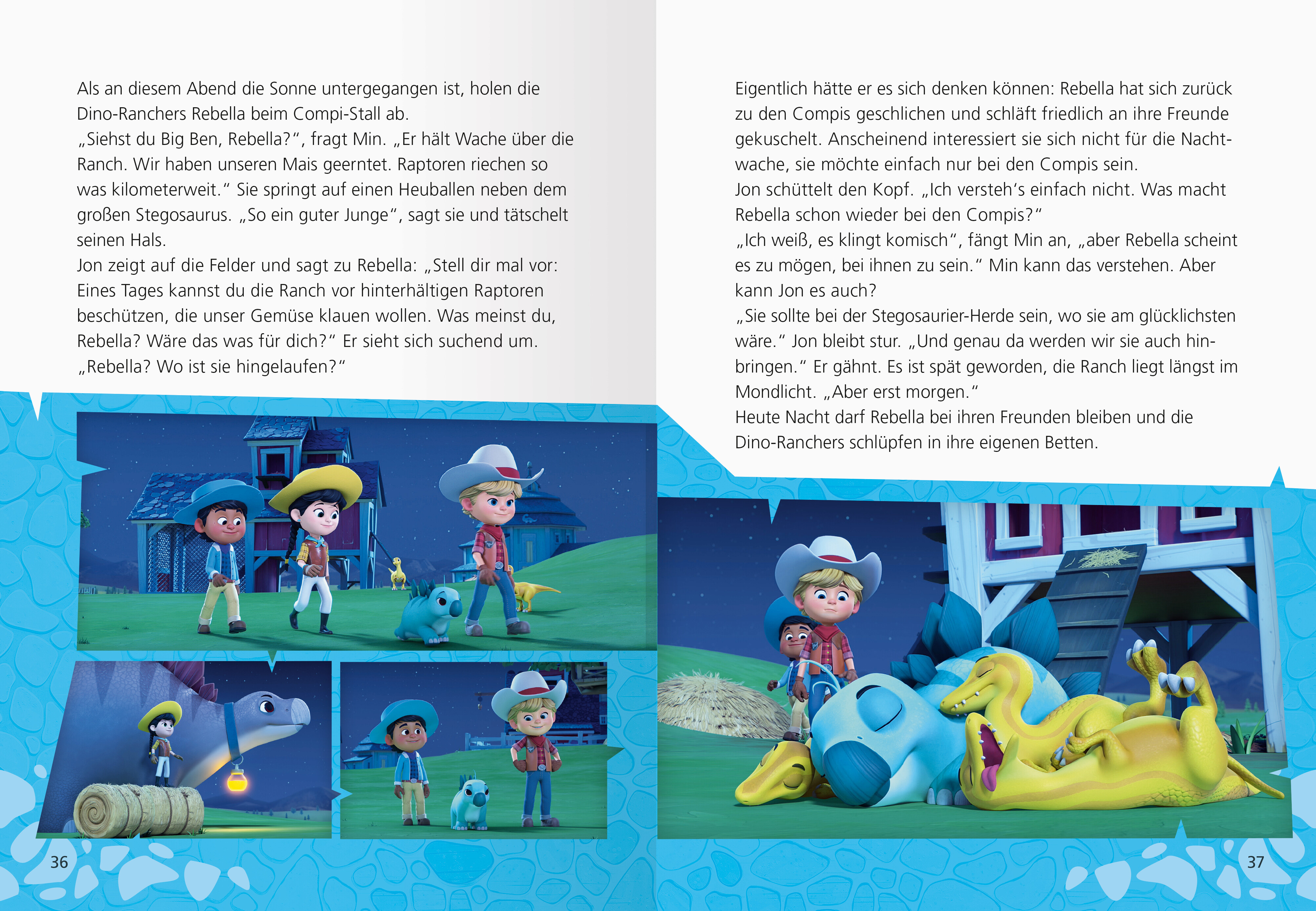 Dann kuscheln sich alle in ihre Betten, um sich von den Abenteuern des Tages auszuruhen. Alle? Nicht ganz: Der kleine Flugsaurier Pteddy fühlt sich in seinem neuen Nest unwohl und kann nicht schlafen. Doch keine Sorge: Auch dafür finden die Dino-Ranchers eine Lösung und am Ende schlummert selbst der wachste Dino ein.