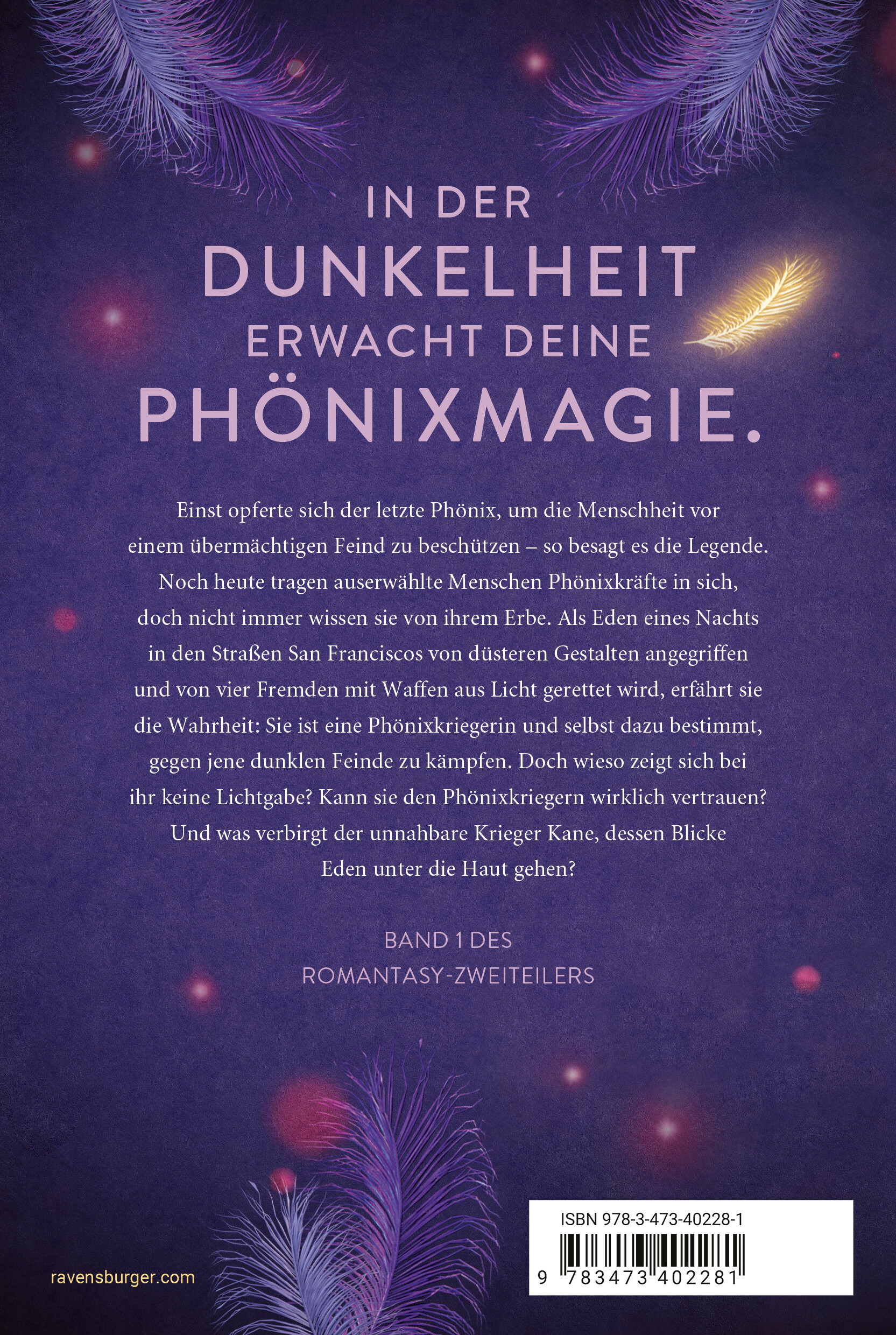 Einst opferte sich der letzte Phönix, um die Menschheit zu beschützen. Noch heute kämpfen auserwählte Menschen mit ihren Phönixkräften gegen dunkle Feinde. Als Eden eines Nachts in den Straßen San Franciscos von düsteren Gestalten angegriffen und von vier Fremden mit Waffen aus Licht gerettet wird, erfährt sie, dass sie selbst eine Phönixkriegerin ist. Doch wieso zeigt sich bei ihr keine Lichtgabe? Und was verbirgt der unnahbare Krieger Kane, dessen Blicke Eden unter die Haut gehen?