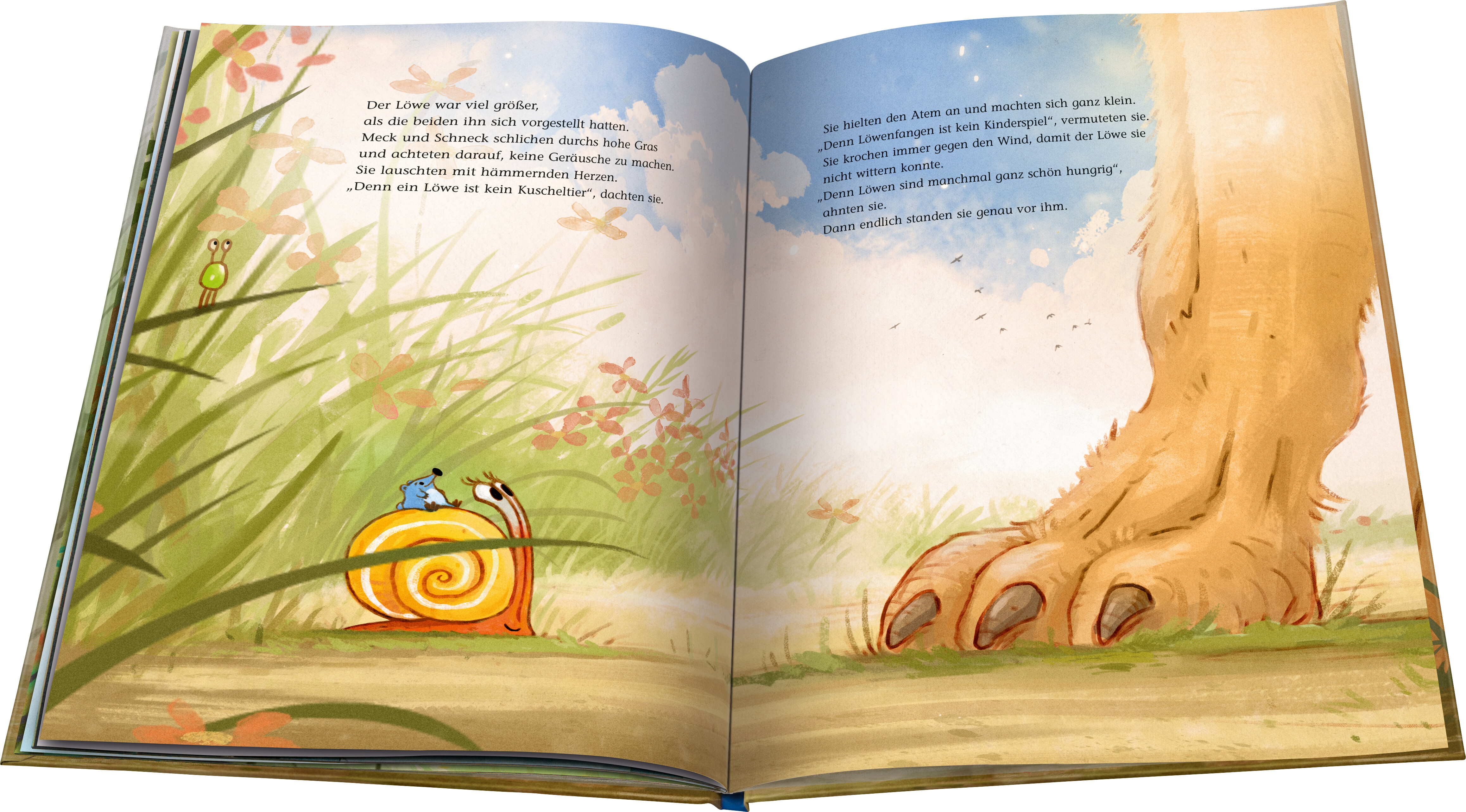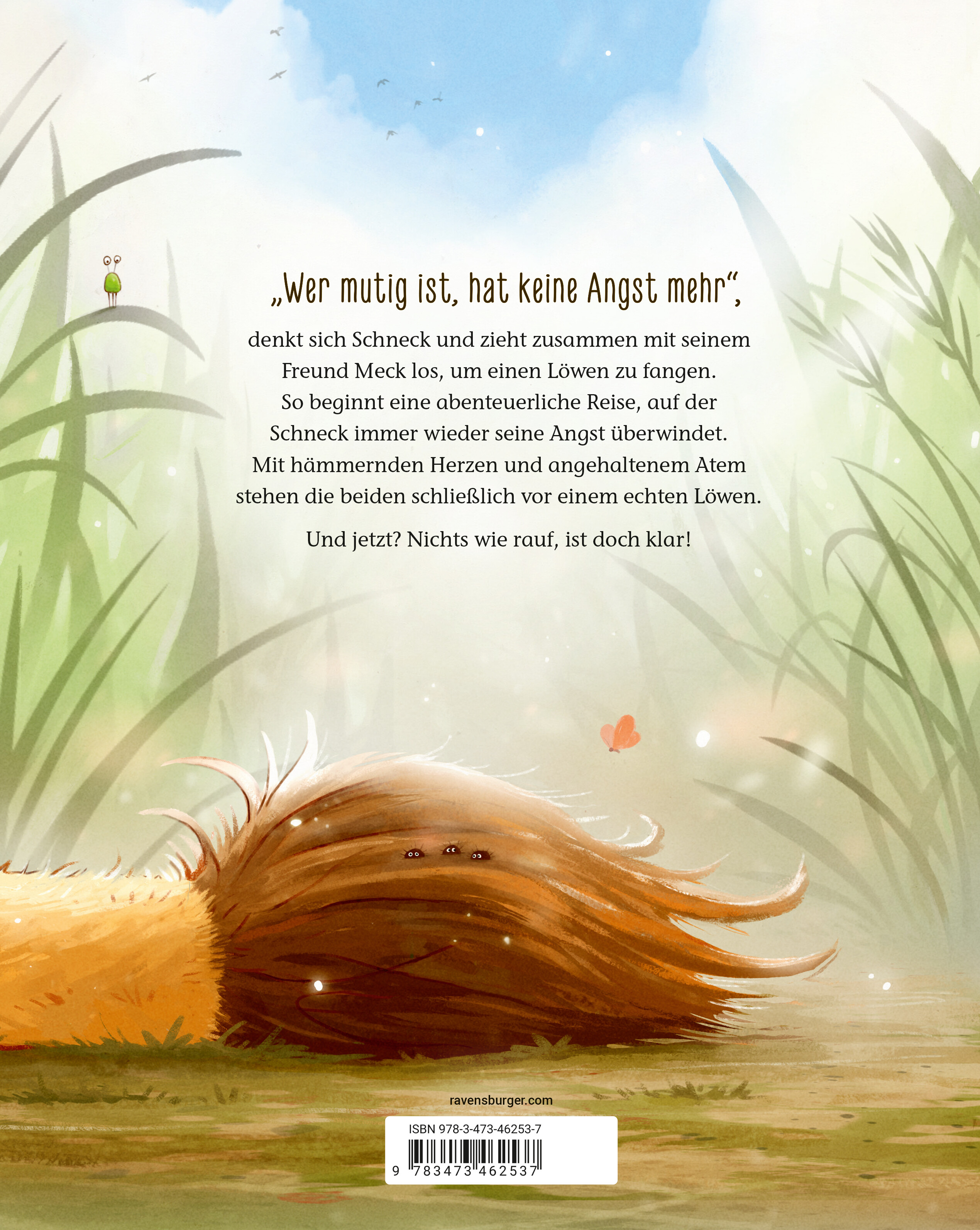 So begeben die beiden sich auf eine abenteuerliche Reise, auf der Schneck immer wieder über seine Angst hinauswächst. Und dann ist es endlich so weit: Mit hämmernden Herzen stehen sie vor einem echten Löwen. Wie gut, dass Meck den besten Weg auf einen Löwen hinauf kennt...