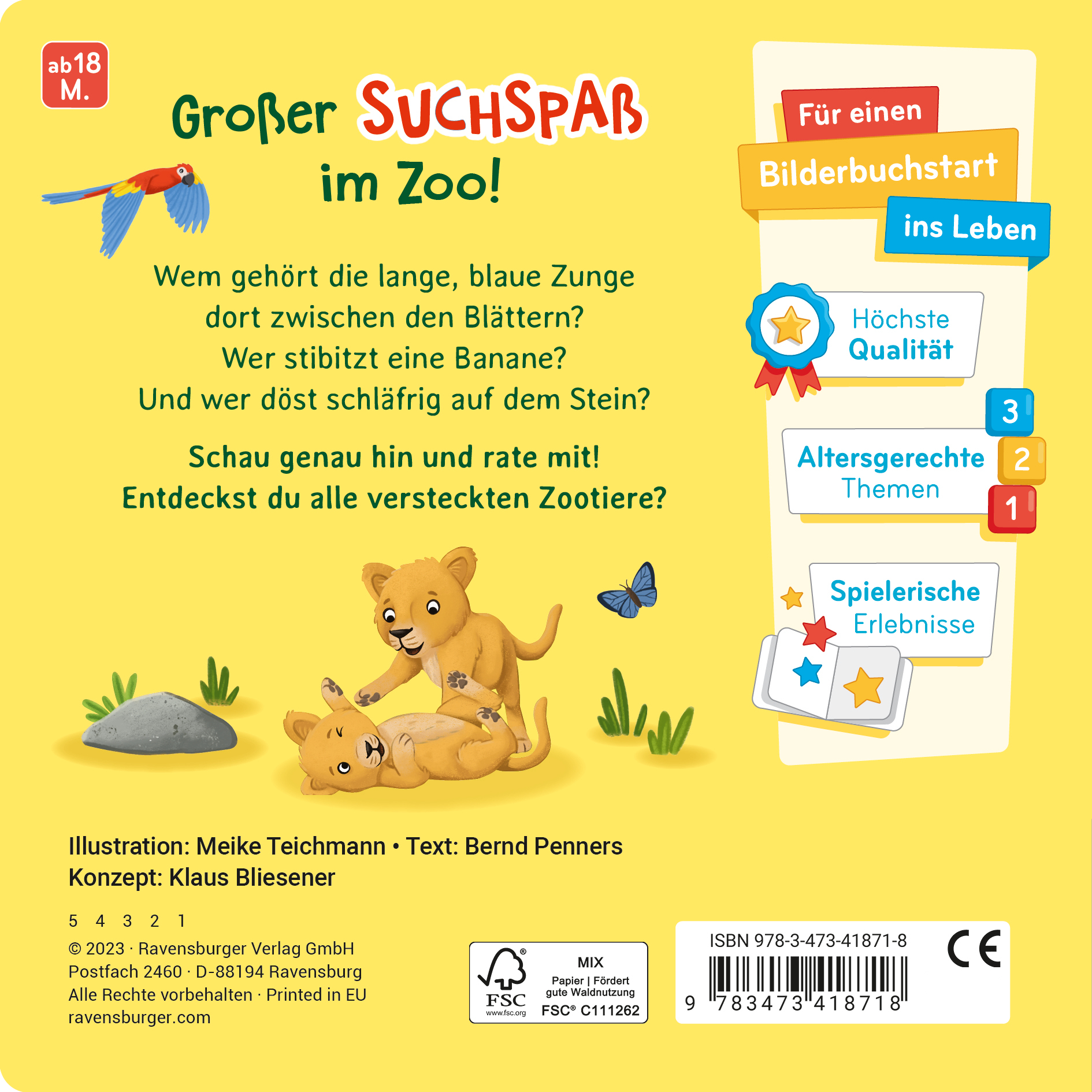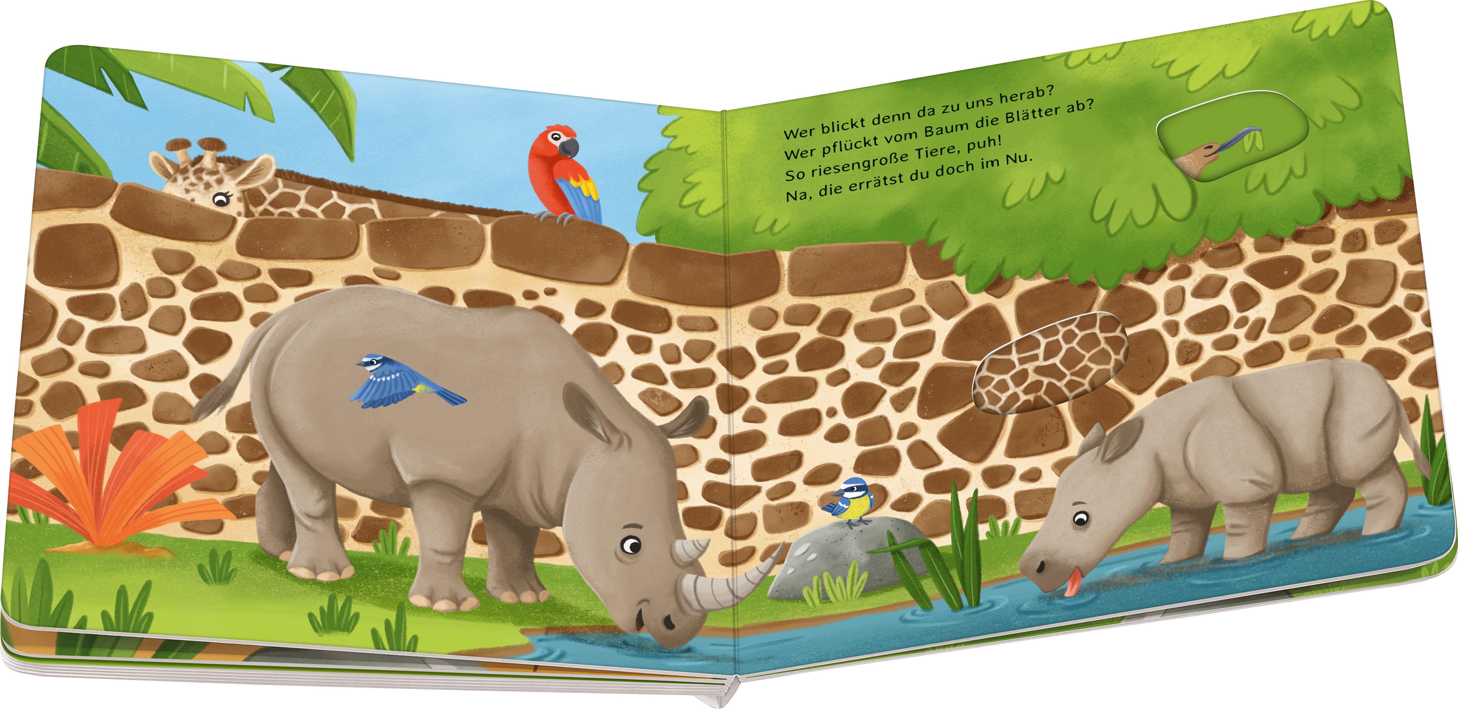 Zahlreiche Gucklöcher auf den Seiten zeigen bestimmte Merkmale von Zootieren. Sie wecken die Neugier der Kleinsten und animieren zum Spielen, Durchschauen und Hineingreifen. Der gereimte Text hilft beim Erraten der versteckten Tiere. Nach dem Umblättern tritt das Tier aus seinem Versteck und es kann überprüft werden, ob richtig geraten wurde.