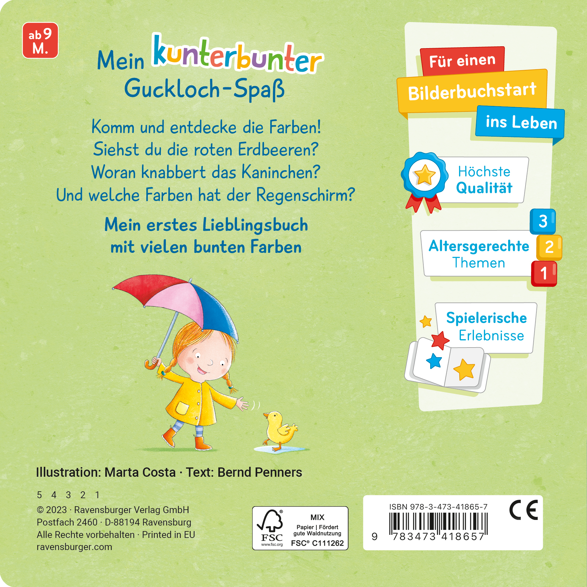 Dieses kunterbunte Buch ist nicht nur ein optischer Hingucker in jedem Kinderzimmer, sondern perfekt auf die Entwicklung von Kindern ab 9 Monaten abgestimmt: Die Gucklöcher lassen sich von kleinen Kinderhänden gut greifen, laden zum spielerischen Entdecken ein und unterstützen so die motorische Entwicklung. Der Rhythmus der kurzen Reime macht Spaß beim Vorlesen, unterstützt das Erkennen und Verstehen der einzelnen Worte und fördert so die sprachliche Entwicklung.