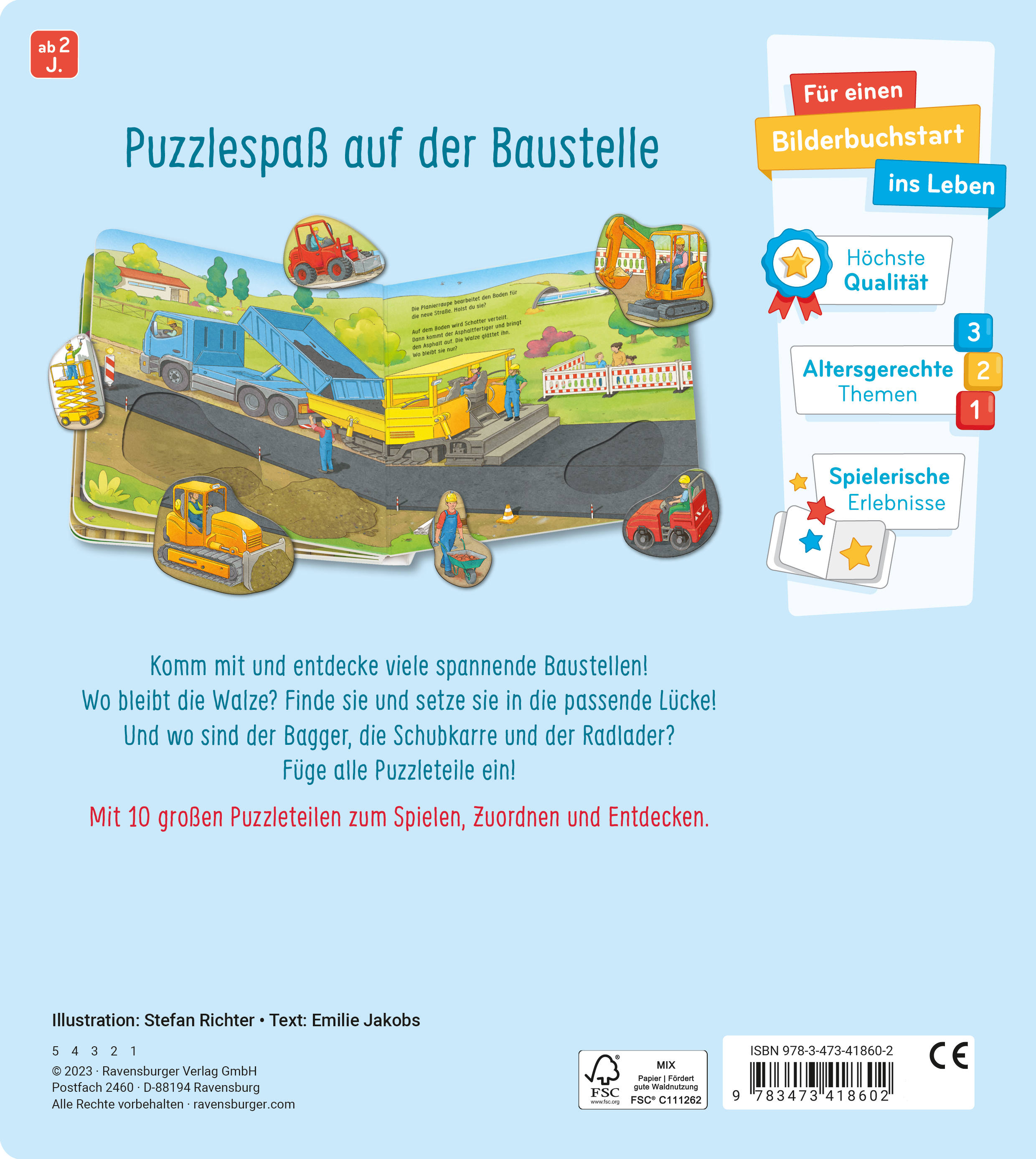 Entdecke viele spannende Baustellen!_ Zehn stabile Puzzleteile laden dabei zum Zuordnen und Einsetzen ein: Auf dem neu gebauten Spielplatz wird ein Bagger benötigt, die Zimmerleute suchen die Kreissäge und der Radlader bringt den Arbeitern Pflastersteine für den Fußweg. Weißt du auch, wo die anderen Gegenstände und Fahrzeuge gebraucht werden?_ Kurze, leicht verständliche Texte helfen beim Zuordnen, erzählen kleine Geschichten und machen Lust, die verschiedenen Baustellen zu entdecken.