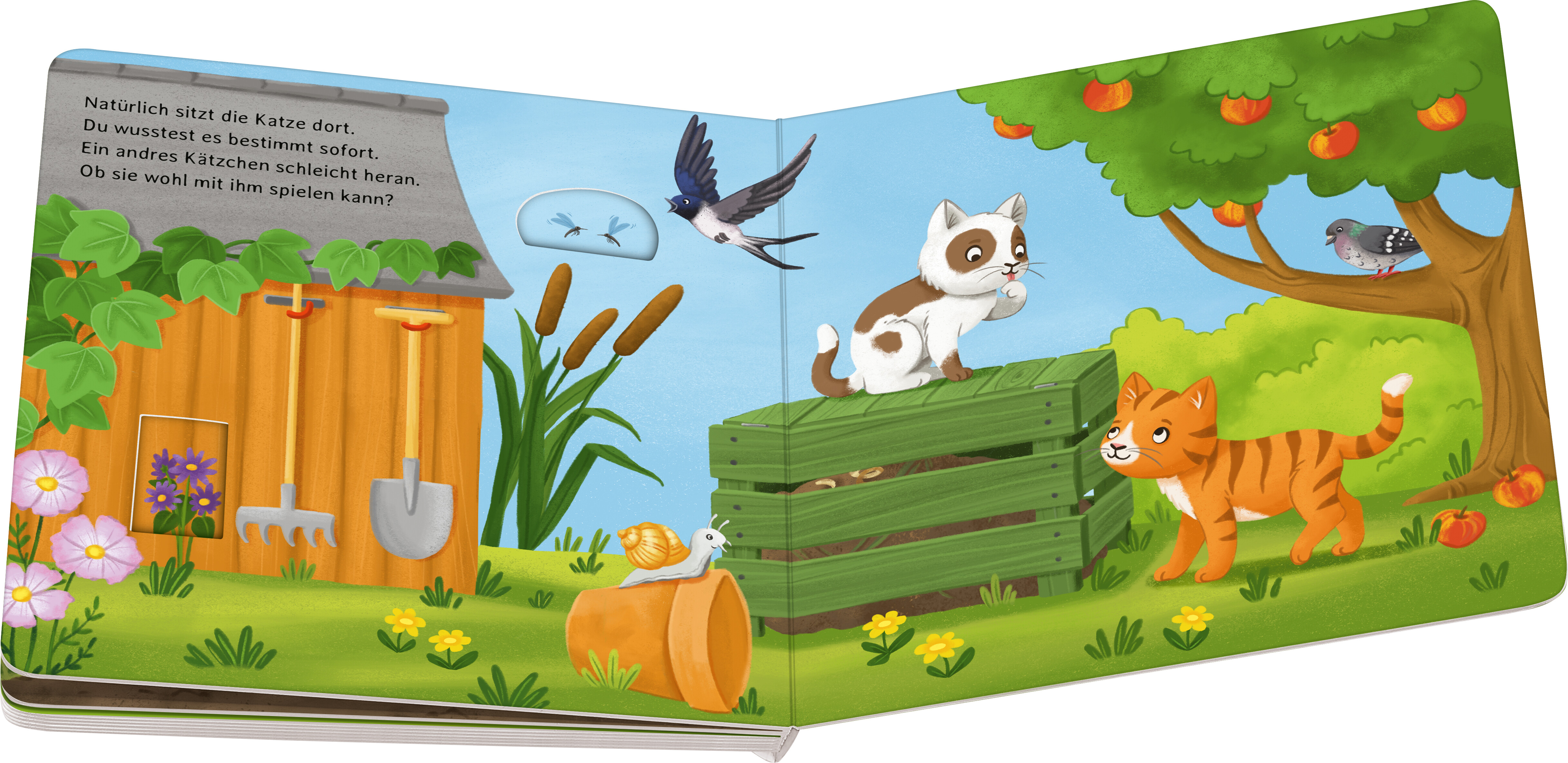 Zahlreiche Gucklöcher auf den Seiten zeigen bestimmte Merkmale von Tieren im Garten. Sie wecken die Neugier der Kleinsten und animieren zum Spielen, Durchschauen und Hineingreifen. Der gereimte Text hilft beim Erraten der versteckten Tiere. Nach dem Umblättern tritt das Tier aus seinem Versteck und es kann überprüft werden, ob richtig geraten wurde.