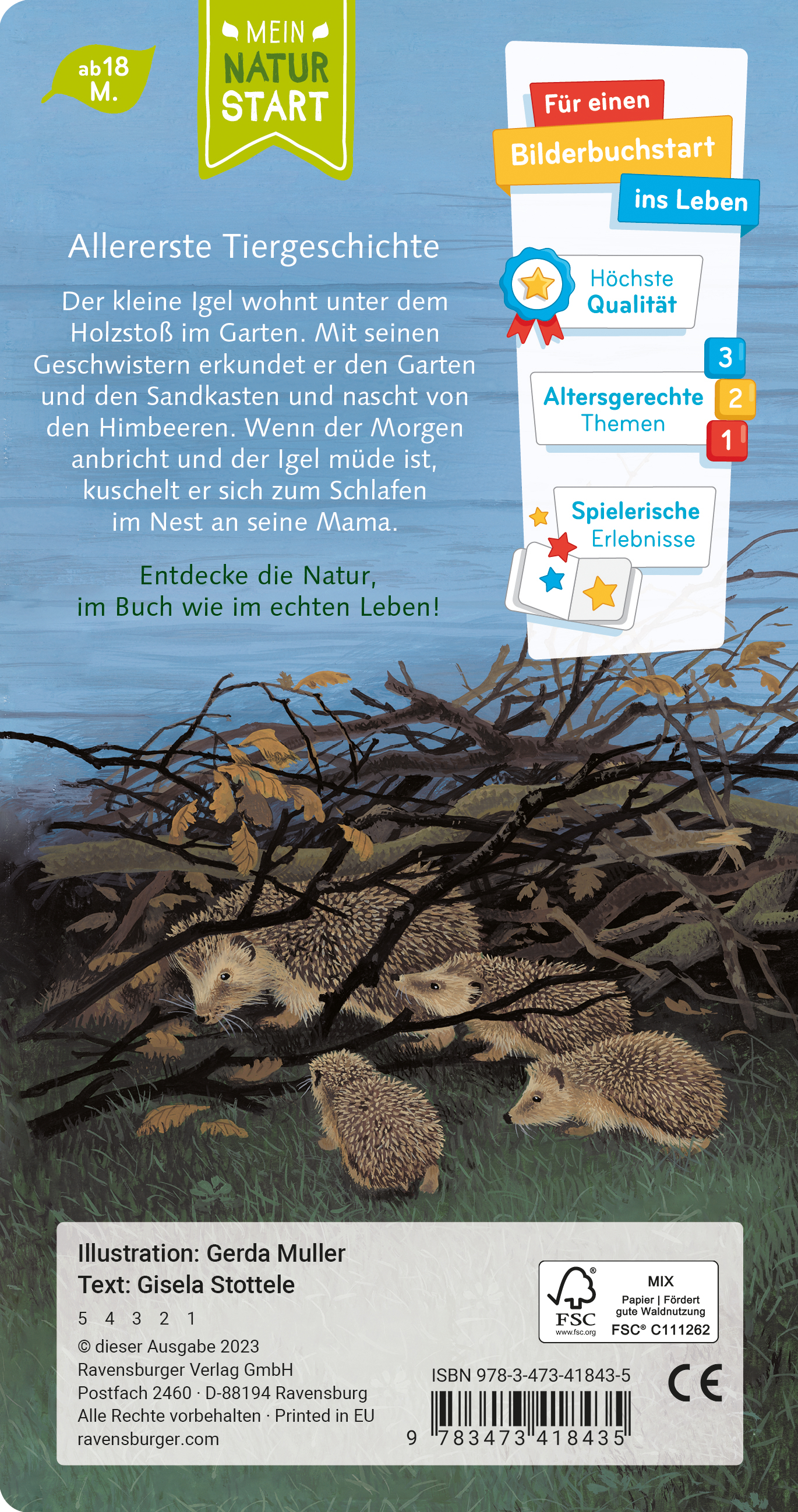 Zusammen mit seinen Geschwistern wohnt der kleine Igel unter einem Holzstoß im Garten. Neugierig macht er sich alleine auf eine Entdeckungsreise und erlebt spannende Abenteuer. Gegen Abend kommt auch Mama in den Garten und fängt den kleinen Ausreißer wieder ein. Zusammen mit den Geschwistern suchen sie nach Futter. Nach einer aufregenden Nacht kuschelt er sich im Nest zu seiner Mama. Eine liebevolle Vorlesegeschichte mit einprägsamem Text für kleine Naturentdecker._