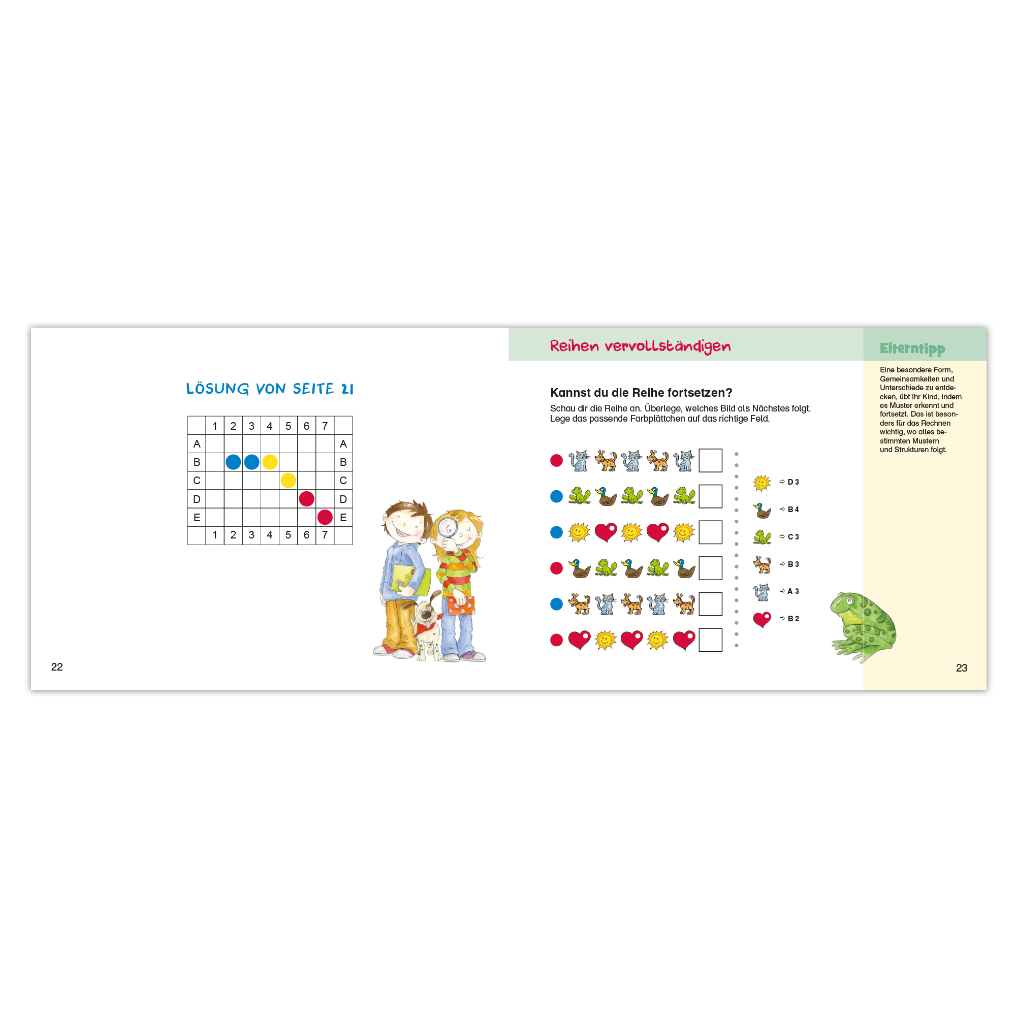 - Selbstständiges Üben und kinderleichte Selbstkontrolle: das richtige Lösungsmuster ermöglicht den kinderleichten Abgleich.