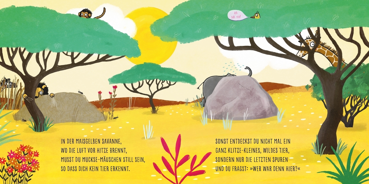 In der Savanne ist nichts los? Von wegen! Siehst du den Pfotenabdruck? Und das Häufchen? Und wer hat denn hier am Baumstamm gekratzt? Auf jeder Seite gibt es ein Lieblingstier zu entdecken, das sich versteckt hat. Kleinkinder gehen auf die Suche und lernen spielerisch etwas über die Spuren, die die Tiere hinterlassen haben. Mit dabei: Elefant, Löwe, Giraffe, Zebra und Affe.