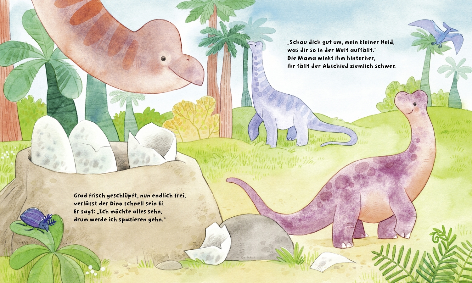 Der kleine Langhals erlebt sein erstes Abenteuer und lernt dabei die anderen Dinosaurier kennen. Manche haben Hörner, manche können fliegen, manche schwimmen und wieder andere können richtig schnell rennen. Und manche Dinos sehen sogar ein bisschen gefährlich aus, auch wenn sie nur Pflanzen fressen. "Was kann ich besonders gut?" fragt das Dino-Baby seine Mama, nachdem es all die anderen Urzeittiere getroffen hat. Na klar, mit seinem langen Hals kommt es an die leckersten Blätter heran. Denn die hängen ja bekanntlich weiter oben an Bäumen und Sträuchern.