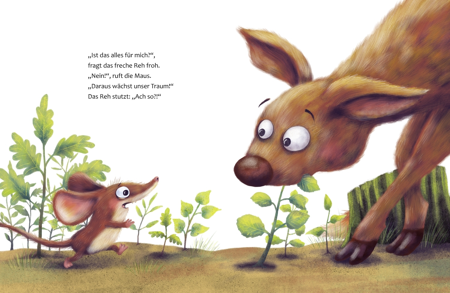 Der Wald ist zerstört und das Mäuschen möchte ihn neu anpflanzen. Ganz allein fängt es an, Schösslinge und Eicheln einzubuddeln. Puh, ist das mühsam! Doch da kommt plötzlich ein Freund und hilft mit. Und dann kommt noch ein Tier, und noch eins. Je mehr sie werden, desto mehr Freude haben sie an ihrem großen Plan. Und dem Mäuschen wird klar: Gemeinsam können wir alles schaffen! Aus einem Traum wird Wirklichkeit.