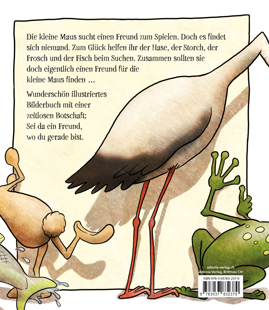Die kleine Maus sucht einen Freund zum Spielen. Doch es findet sich niemand. Zum Glück helfen ihr der Hase, der Storch, der Frosch und der Fisch beim Suchen. Zusammen sollten sie doch eigentlich einen Freund für die kleine Maus finden …