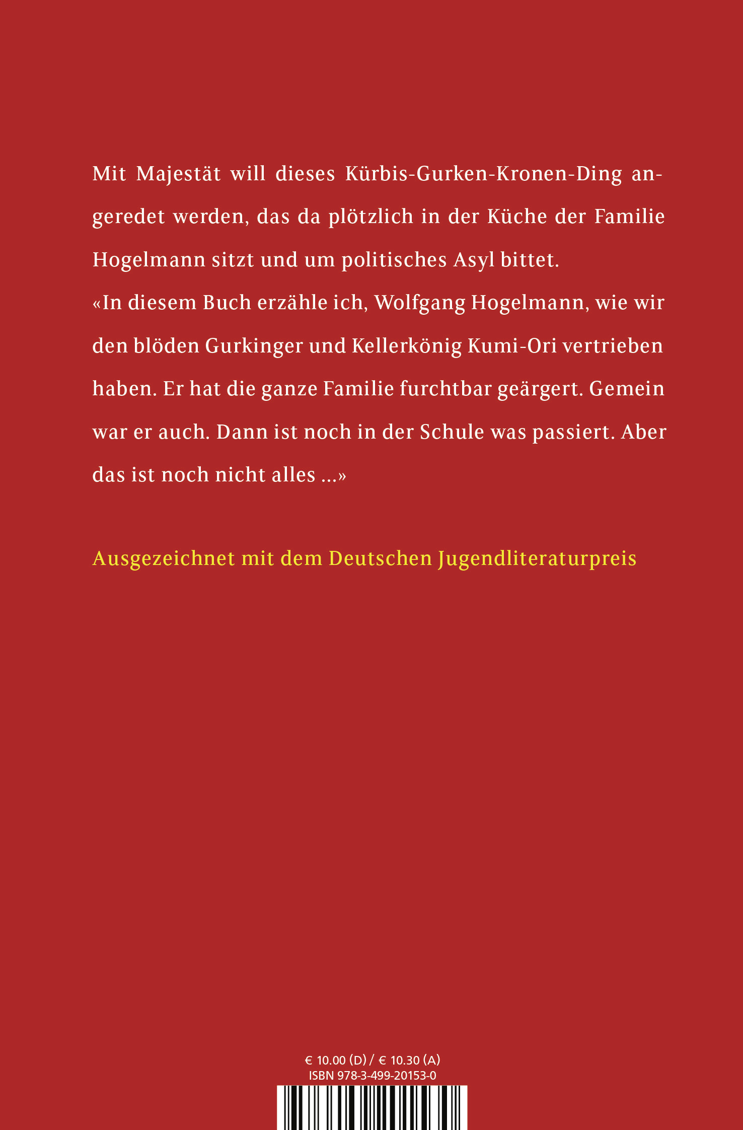 lt;p>Mit Majestät will dieses Kürbis-Gurken-Kronen-Ding angeredet werden, das da plötzlich in der Küche der Familie Hogelmann sitzt und um politisches Asyl bittet. «In diesem Buch erzähle ich, Wolfgang Hogelmann, wie wir den blöden Gurkinger und Kellerkönig Kumi-Ori vertrieben haben. Er hat die ganze Familie furchtbar geärgert. Gemein war er auch. Dann ist noch in der Schule was passiert. Aber das ist noch nicht alles ...» Ausgezeichnet mit dem Deutschen Jugendliteraturpreis