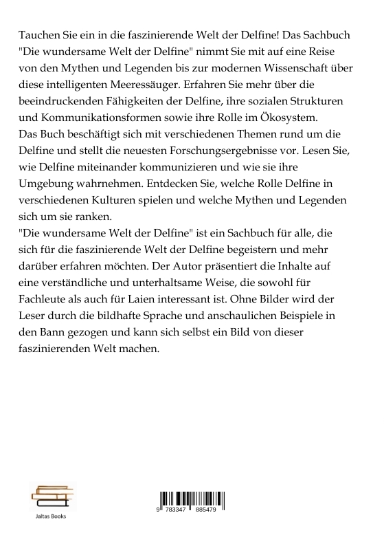 Tauchen Sie ein in die faszinierende Welt der Delfine! Das Sachbuch "Die wundersame Welt der Delfine" nimmt Sie mit auf eine Reise von den Mythen und Legenden bis zur modernen Wissenschaft über diese intelligenten Meeressäuger. Erfahren Sie mehr über die beeindruckenden Fähigkeiten der Delfine, ihre sozialen Strukturen und Kommunikationsformen sowie ihre Rolle im Ökosystem.Das Buch beschäftigt sich mit verschiedenen Themen rund um die Delfine und stellt die neuesten Forschungsergebnisse vor. Lesen Sie, wie Delfine miteinander kommunizieren und wie sie ihre Umgebung wahrnehmen. Entdecken Sie, welche Rolle Delfine in verschiedenen Kulturen spielen und welche Mythen und Legenden sich um sie ranken."Die wundersame Welt der Delfine" ist ein Sachbuch für alle, die sich für die faszinierende Welt der Delfine begeistern und mehr darüber erfahren möchten. Der Autor präsentiert die Inhalte auf eine verständliche und unterhaltsame Weise, die sowohl für Fachleute als auch für Laien interessant ist. Ohne Bilder wird der Leser durch die bildhafte Sprache und anschaulichen Beispiele in den Bann gezogen und kann sich selbst ein Bild von dieser faszinierenden Welt machen.