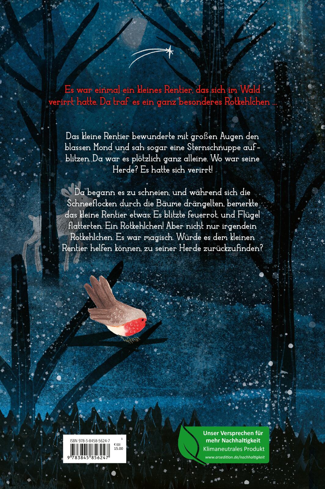 Da begann es zu schneien und während sich die Schneeflocken durch die Bäume drängelten, bemerkte das kleine Rentier etwas: Es blitzte feuerrot und Flügel flatterten wild direkt vor der Nase des kleinen Rentiers. Ein Rotkehlchen! Aber nicht nur irgendein Rotkehlchen. Das Rotkehlchen hatte Zauberkräfte. Würde es dem kleinen Rentier helfen können, zu seiner Herde zurückzufinden?